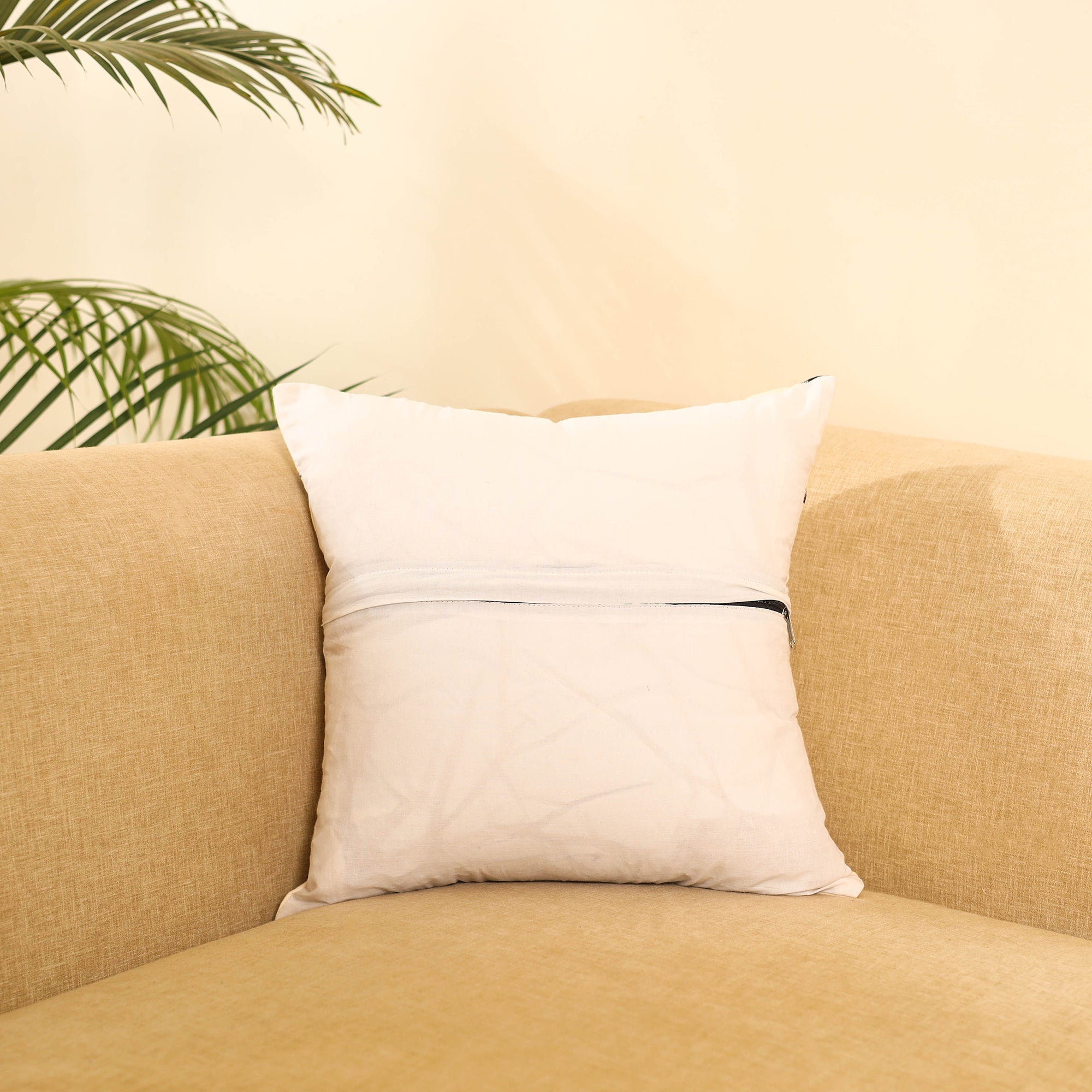 Elevate your space with this off white cushion cover made from traditional Ikat cotton and ajrakh modal silk patchwork. Showcasing intricate patterns and handcrafted charm, it beautifully blends heritage artistry with modern comfort. A perfect addition to your home décor, bringing culture and elegance to your living space.