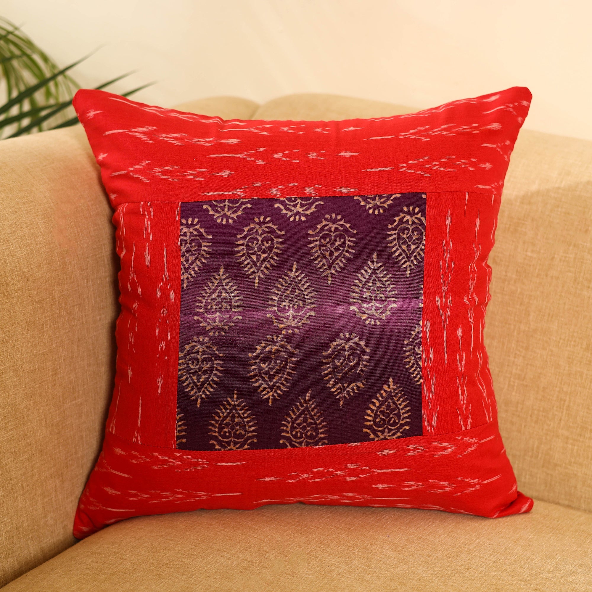 Elevate your space with this red cushion cover made from traditional Ikat cotton and ajrakh modal silk patchwork. Showcasing intricate patterns and handcrafted charm, it beautifully blends heritage artistry with modern comfort. A perfect addition to your home décor, bringing culture and elegance to your living space.