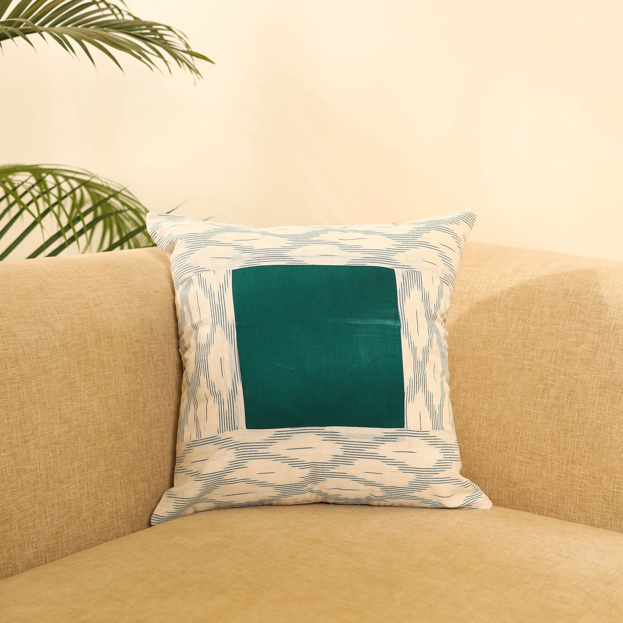 Elevate your space with this white cushion cover made from traditional Ikat cotton and plain modal silk patchwork. Showcasing intricate patterns and handcrafted charm, it beautifully blends heritage artistry with modern comfort. A perfect addition to your home décor, bringing culture and elegance to your living space.