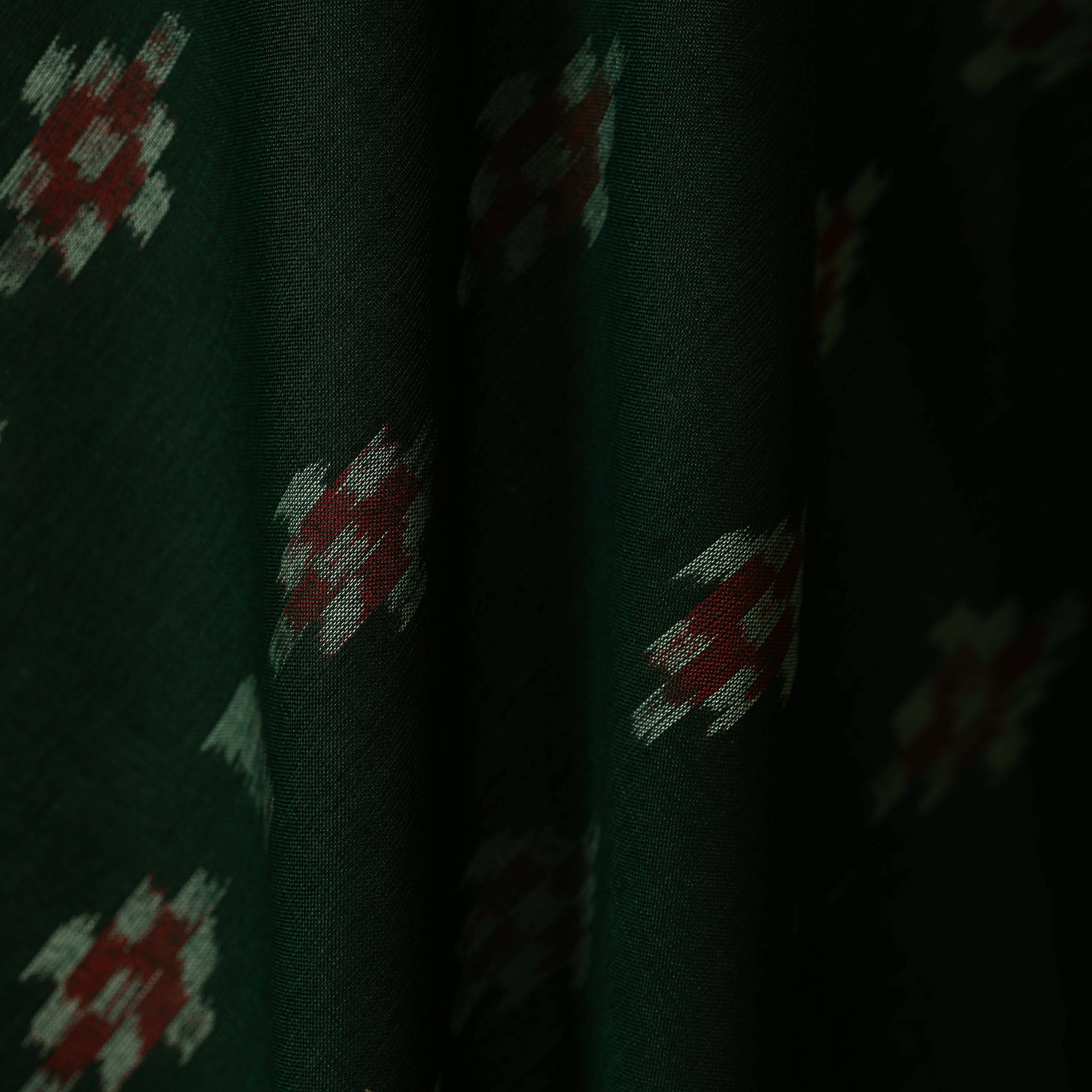 Green sambalpuri Ikat handloom cotton fabric from Odisha features traditional motifs such as shankha, chakra and phula. It is crafted by skilled artisans of eastern India using the Ikat technique, where the threads are dyed before weaving. This breathable fabric is easy to stitch, making it ideal for creating kurtas, dresses or home decor items.