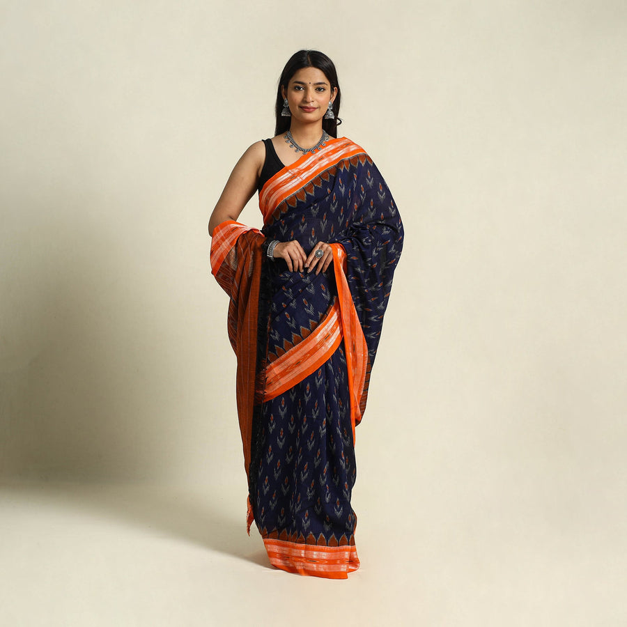 This blue sambalpuri cotton saree is handwoven by skilled artisans from Odisha using the traditional ikat technique. Made from breathable cotton, it features iconic motifs like shells, wheels, and flowers. Comfortable and stylish, it's a perfect choice for both everyday wear and festive occasions.