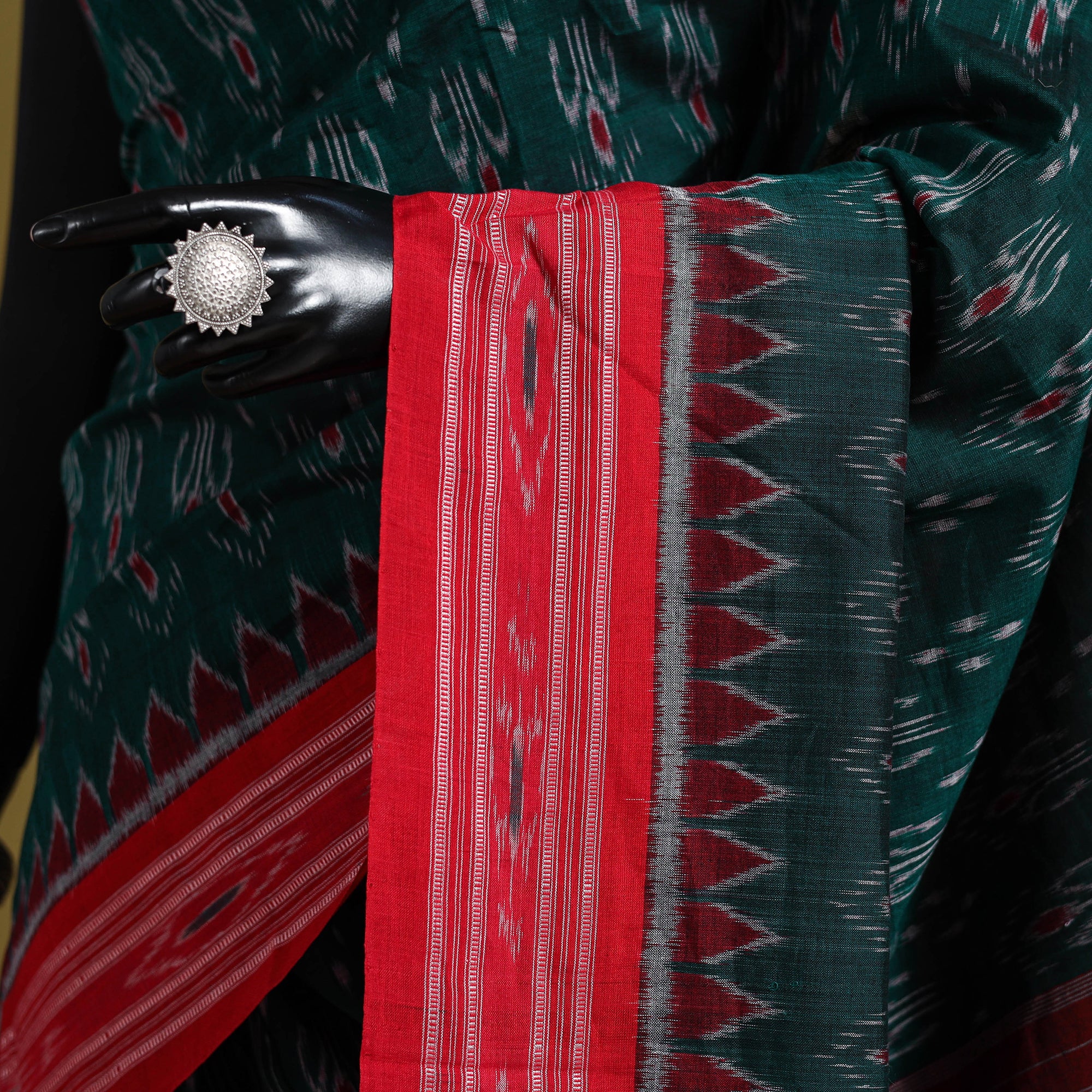 Green sambalpuri ikat cotton saree is woven by skilled artisans from Odisha using the traditional sambalpuri ikat technique. Made from soft, breathable cotton, it features intricate motifs like shells, wheels, and geometric patterns that reflect Odisha’s rich cultural heritage. Lightweight, elegant, and easy to drape, this saree is perfect for everyday comfort as well as festive occasions.