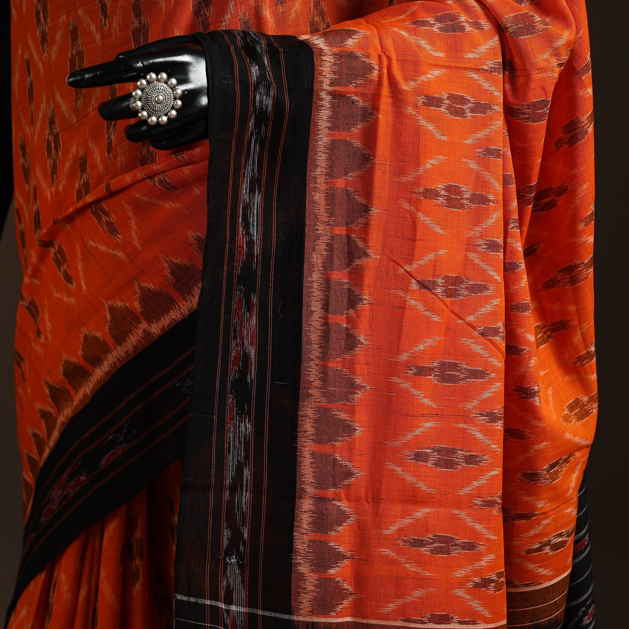 Orange handloom sambalpuri cotton saree is woven by skilled artisans from Odisha using the traditional Ikat technique, where the threads are dyed before weaving to form the patterns on the fabric. Known for its cultural identity, Sambalpuri weave often features motifs inspired by the region’s traditions, including shells, wheels, and geometric shapes. Lightweight and easy to drape, this saree is perfect for everyday comfort as well as festive occasions.