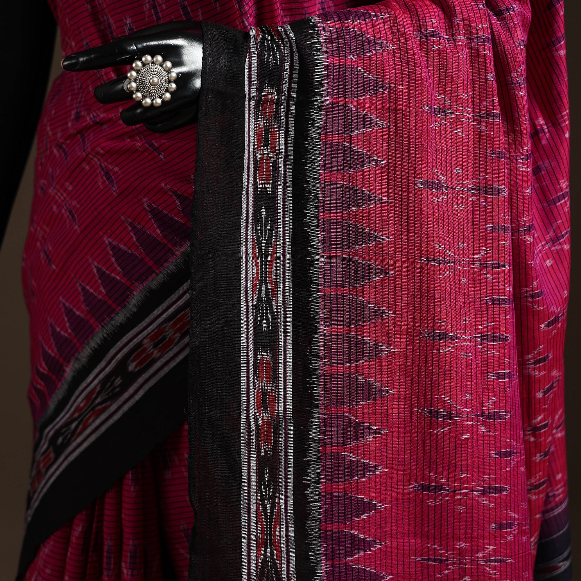 Pink handloom sambalpuri cotton saree is woven by skilled artisans from Odisha using the traditional Ikat technique, where the threads are dyed before weaving to form the patterns on the fabric. Known for its cultural identity, Sambalpuri weave often features motifs inspired by the region’s traditions, including shells, wheels, and geometric shapes. Lightweight and easy to drape, this saree is perfect for everyday comfort as well as festive occasions.