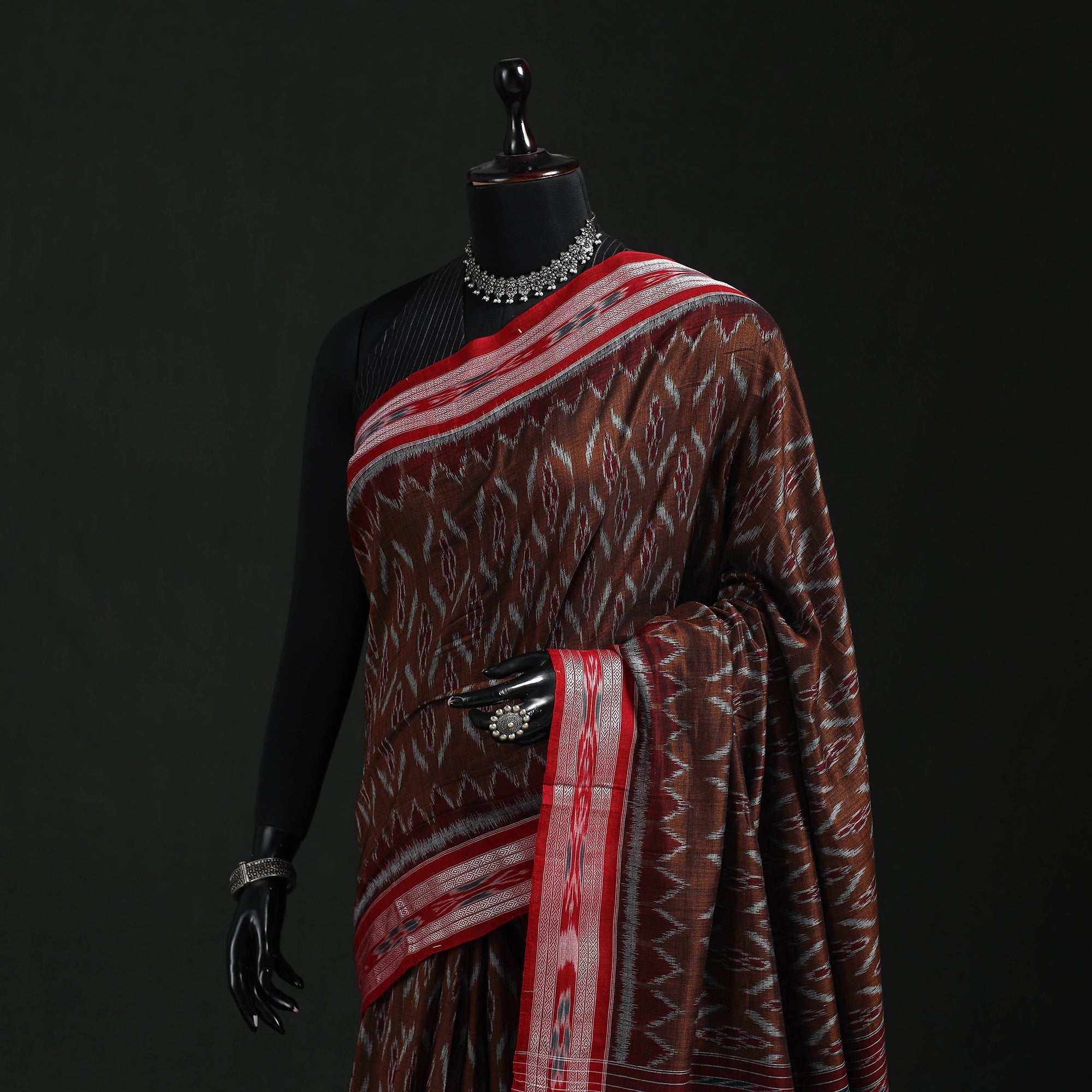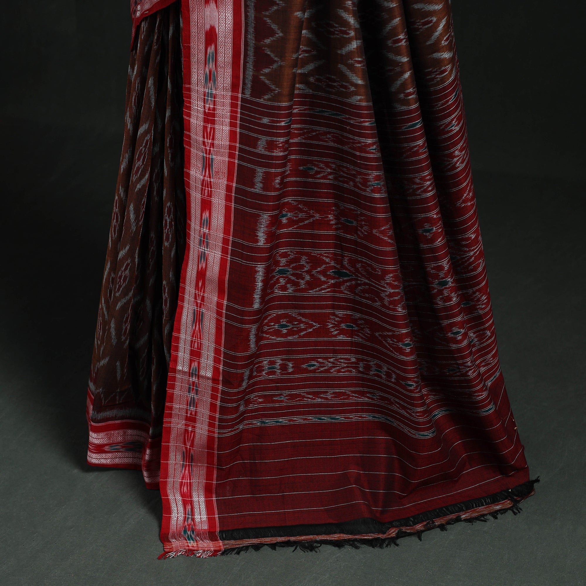 | Material | Brown sambalpuri ikat handloom cotton saree by artisan Ajay Kumar from Odisha, features traditional motifs such as shankha, chakra, and phula. Rooted in a hand weaving tradition that is over 900 years old, it is crafted using the traditional ikat technique, where the yarns are dyed before weaving. Suitable for occasions, cultural events, and traditional gatherings, this saree can also be styled for formal functions and celebrations. Note: This piece carries tiny knots, thread pulls or uneven lines not flaws but fingerprints. Every irregularity is a whisper from the hands that made it. It’s what happens when tradition weaves through time not machines. If you’re looking for perfection, this isn’t it. But if you’re looking for soul you’ve found it. |