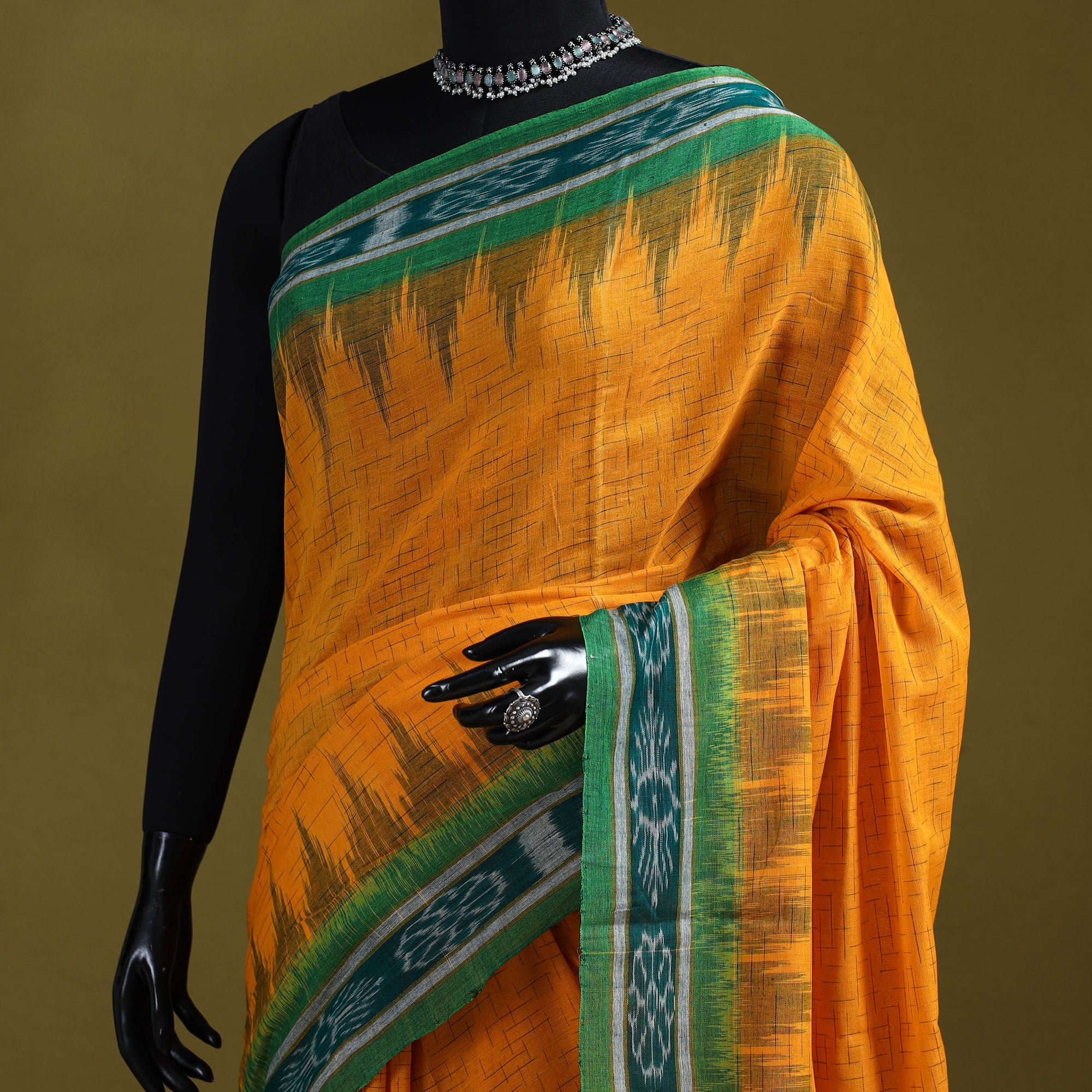 Handloom sambalpuri cotton saree is woven by skilled artisans from Odisha using the traditional ikat technique, where the yarns are carefully dyed before weaving to form patterns. Made from breathable pure cotton it features motifs like shells, wheels and flowers Comfortable and perfect choice for both everyday wear and special occasions.