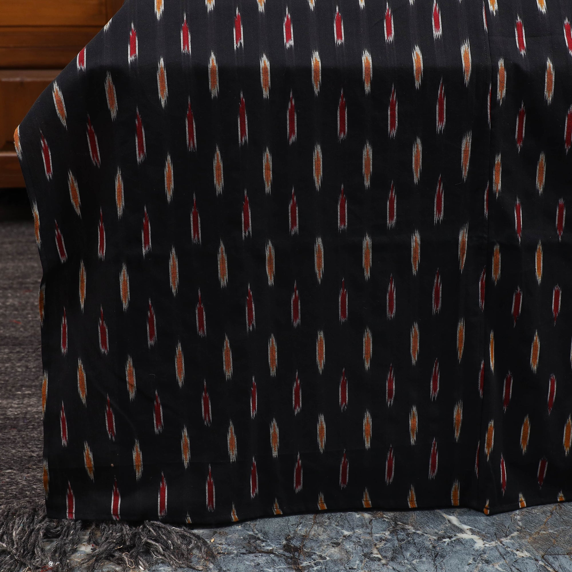 This black cotton bedsheet set beautifully blends pochampally Ikat weave with ajrakh block-printed modal silk patches, reflecting traditional artistry with a contemporary flair. Crafted from breathable cotton, it offers lasting comfort and durability. The intricate detailing adds a handcrafted charm to your living space. The set includes one double bedsheet and two matching pillow covers, perfect for elevating your home decor with a touch of cultural elegance.
