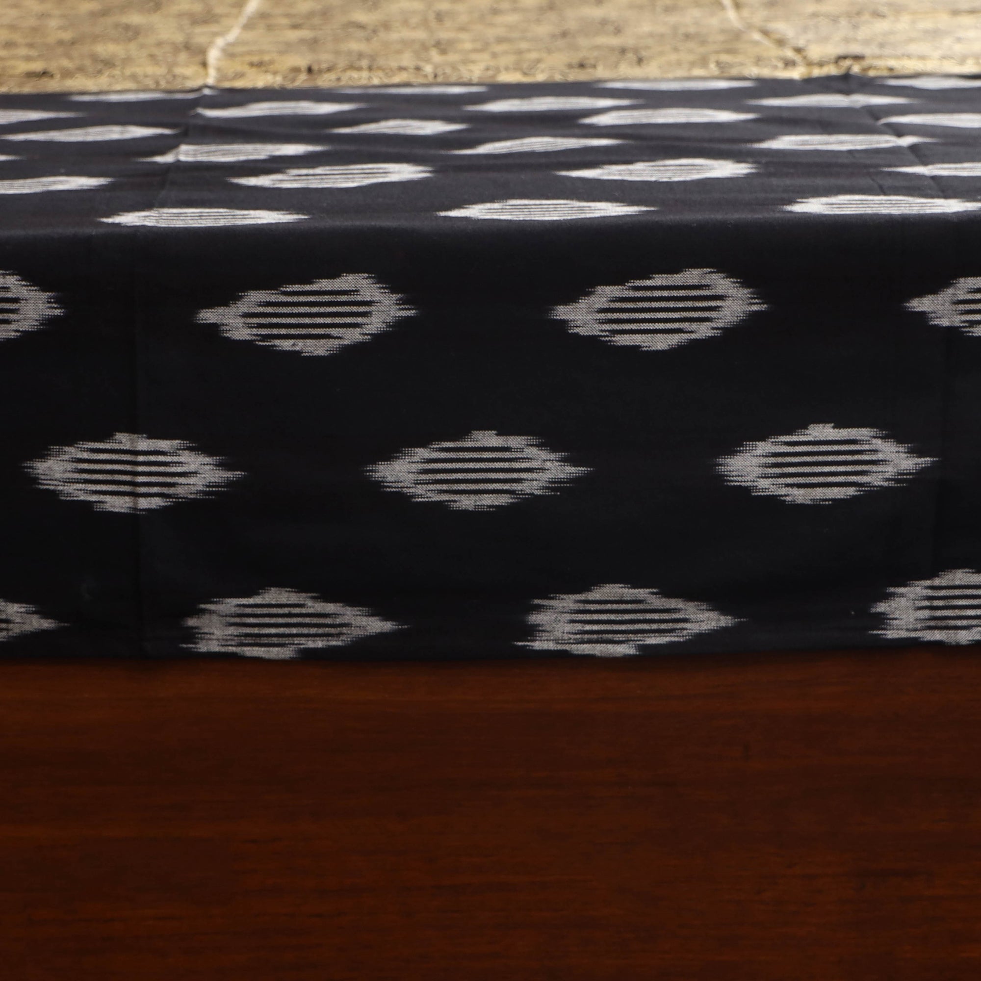 This black cotton bedsheet set beautifully blends pochampally Ikat weave with ajrakh block-printed modal silk patches, reflecting traditional artistry with a contemporary flair. Crafted from breathable cotton, it offers lasting comfort and durability. The intricate detailing adds a handcrafted charm to your living space. The set includes one double bedsheet and two matching pillow covers, perfect for elevating your home decor with a touch of cultural elegance.