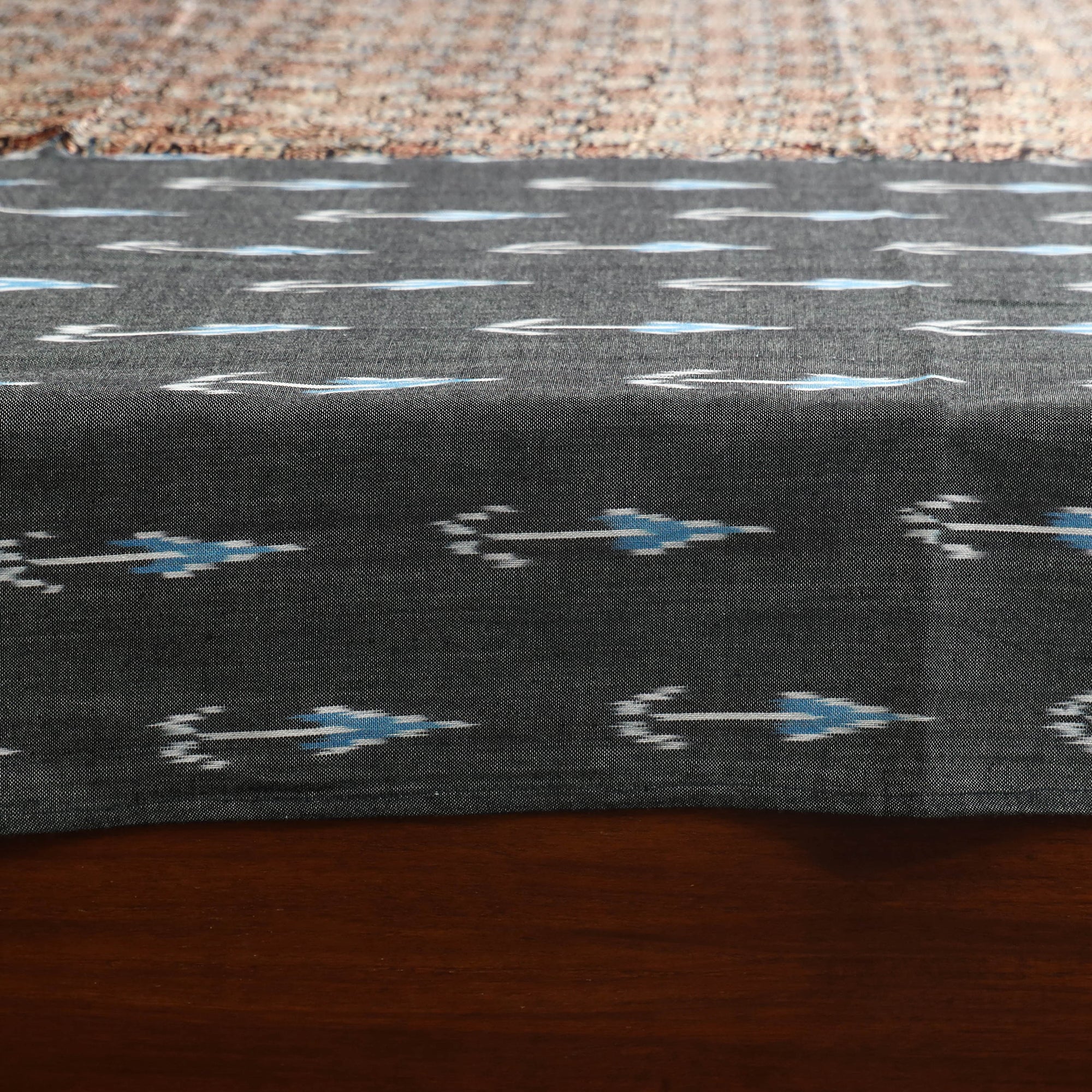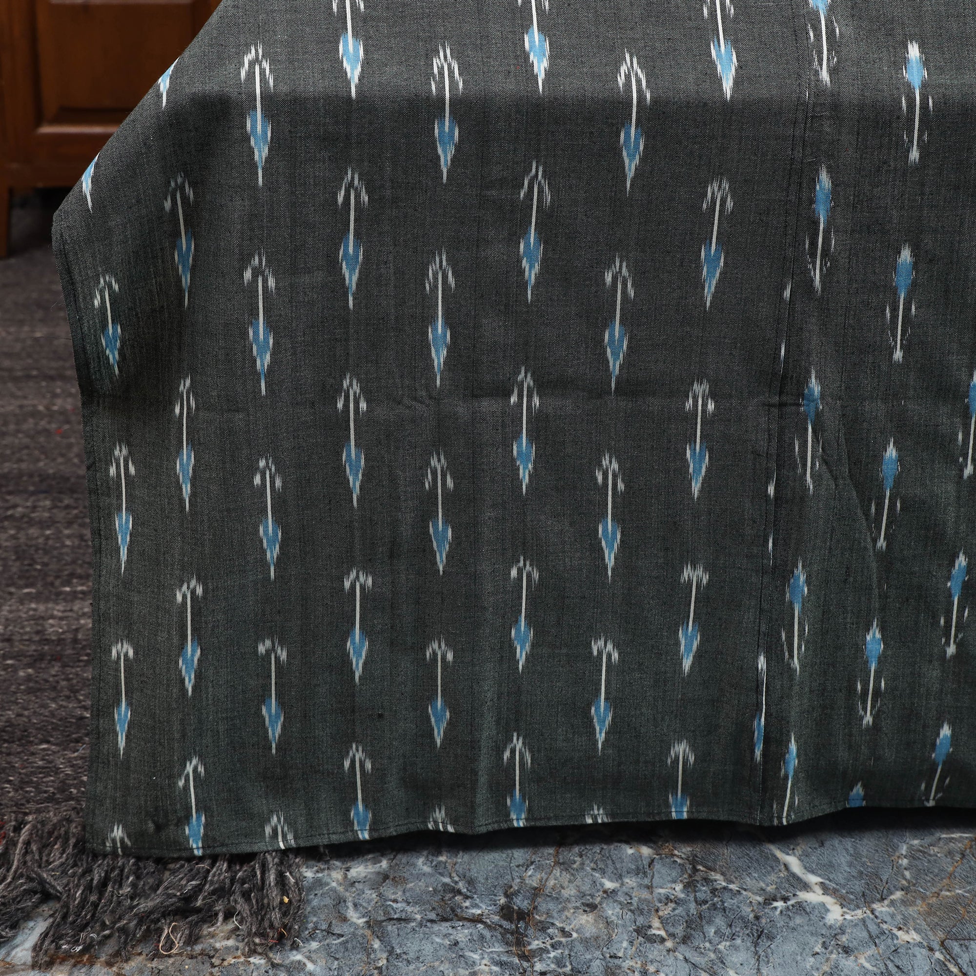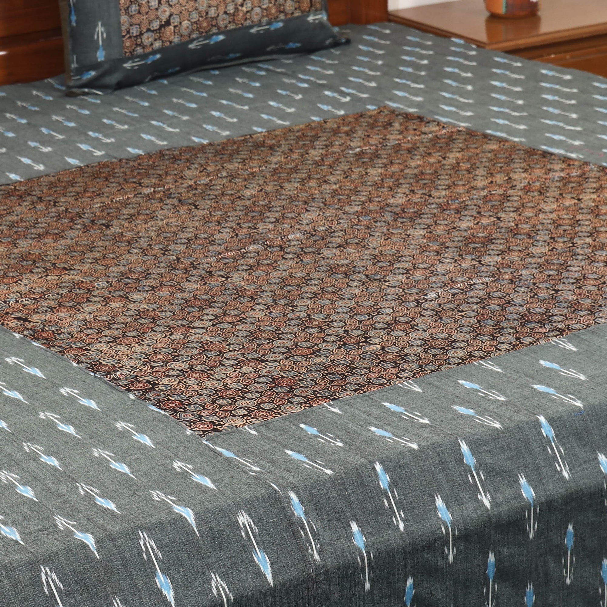 This grey cotton bedsheet set beautifully blends pochampally Ikat weave with ajrakh block-printed modal silk patches, reflecting traditional artistry with a contemporary flair. Crafted from breathable cotton, it offers lasting comfort and durability. The intricate detailing adds a handcrafted charm to your living space. The set includes one double bedsheet and two matching pillow covers, perfect for elevating your home decor with a touch of cultural elegance.