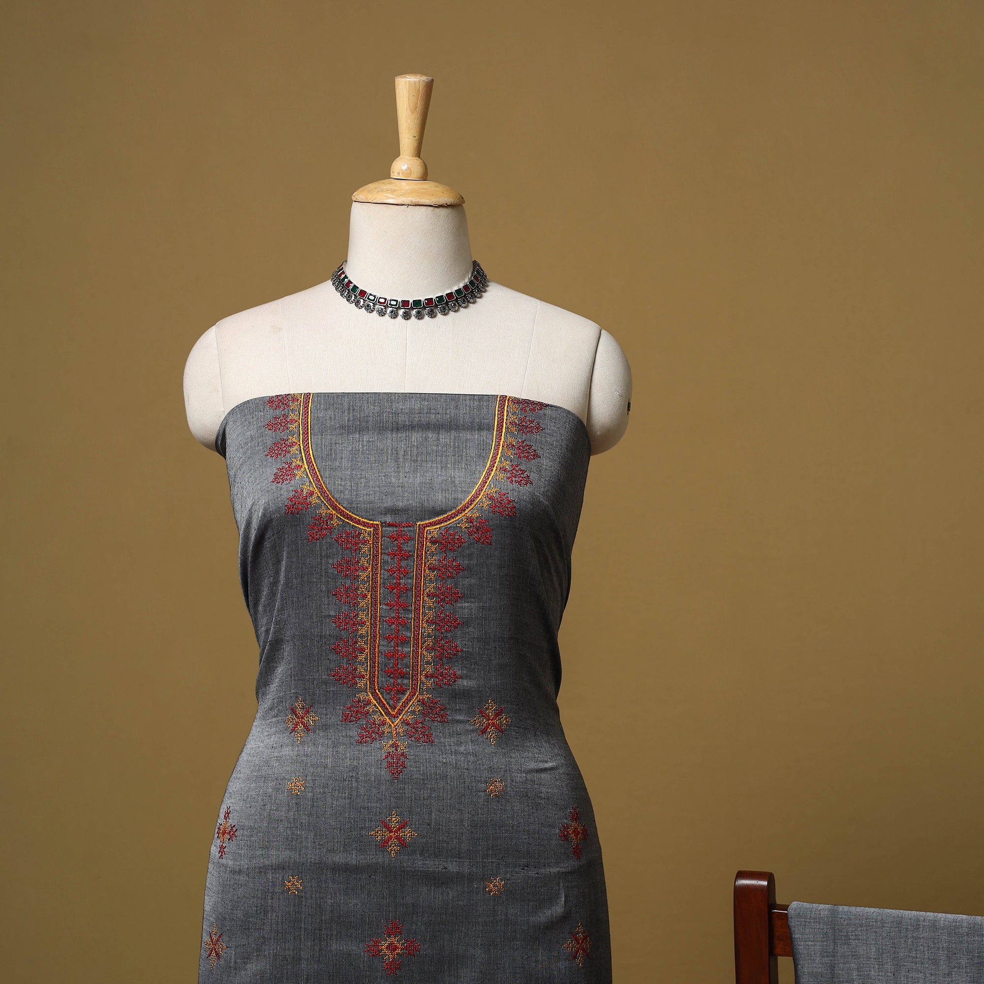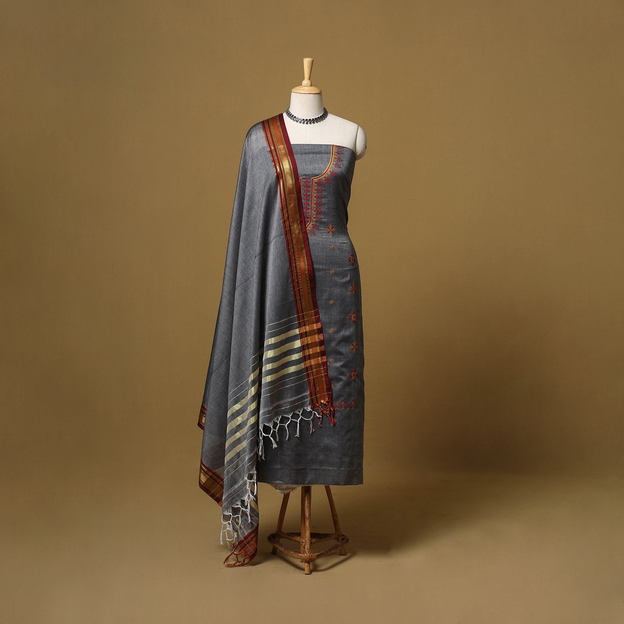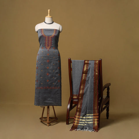 Kasuti embroidery 3pc unstitched dress material is woven in Ilkal, a town in the Bagalkot district of Karnataka. It features machine embroidery inspired by traditional kasuti patterns. The kurta, dupatta and bottom are finished with zari border. Made from cotton it is comfortable to wear and can be stitched as per your preference for daily wear or occasional outings.