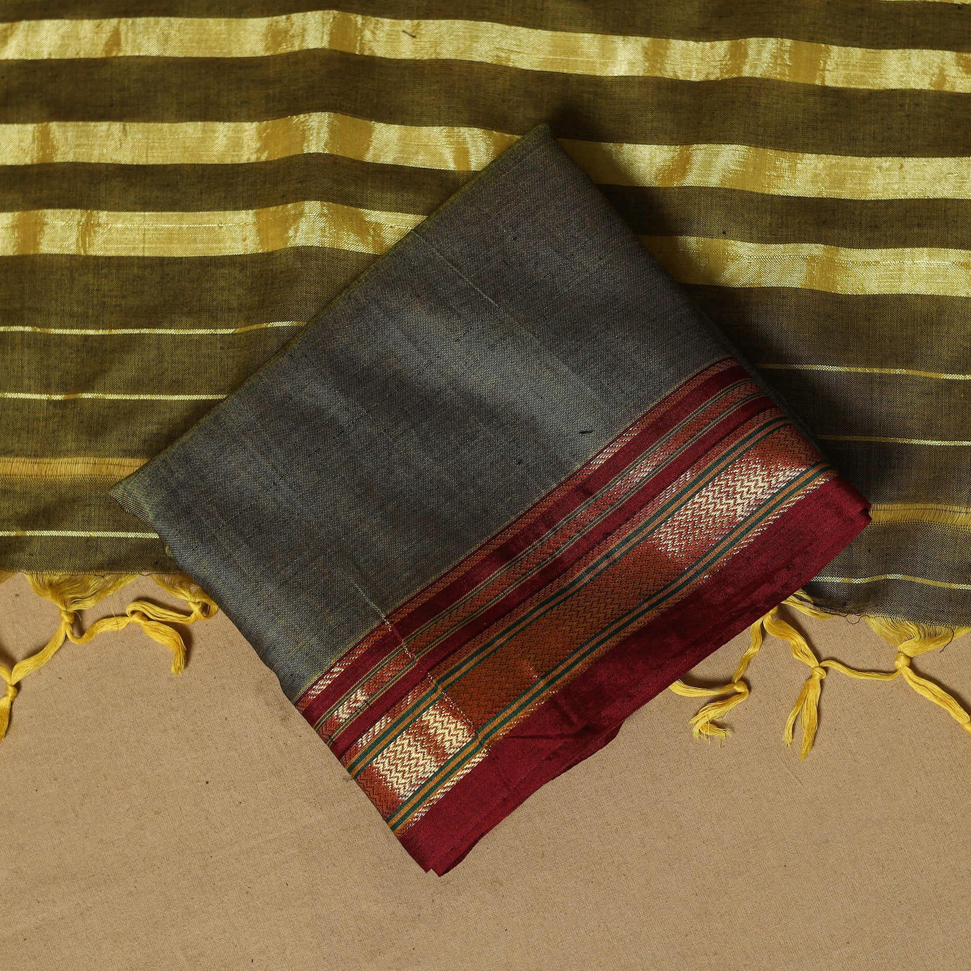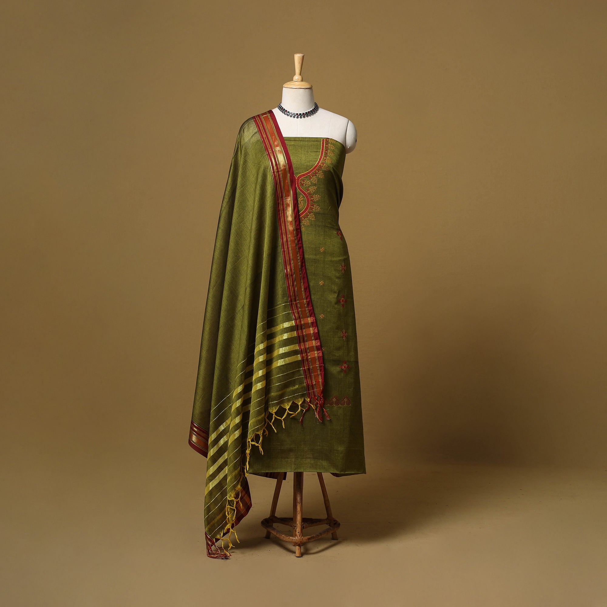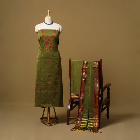 Kasuti embroidery 3pc unstitched dress material is woven in Ilkal, a town in the Bagalkot district of Karnataka. It features machine embroidery inspired by traditional kasuti patterns. The kurta, dupatta and bottom are finished with zari border. Made from cotton it is comfortable to wear and can be stitched as per your preference for daily wear or occasional outings.