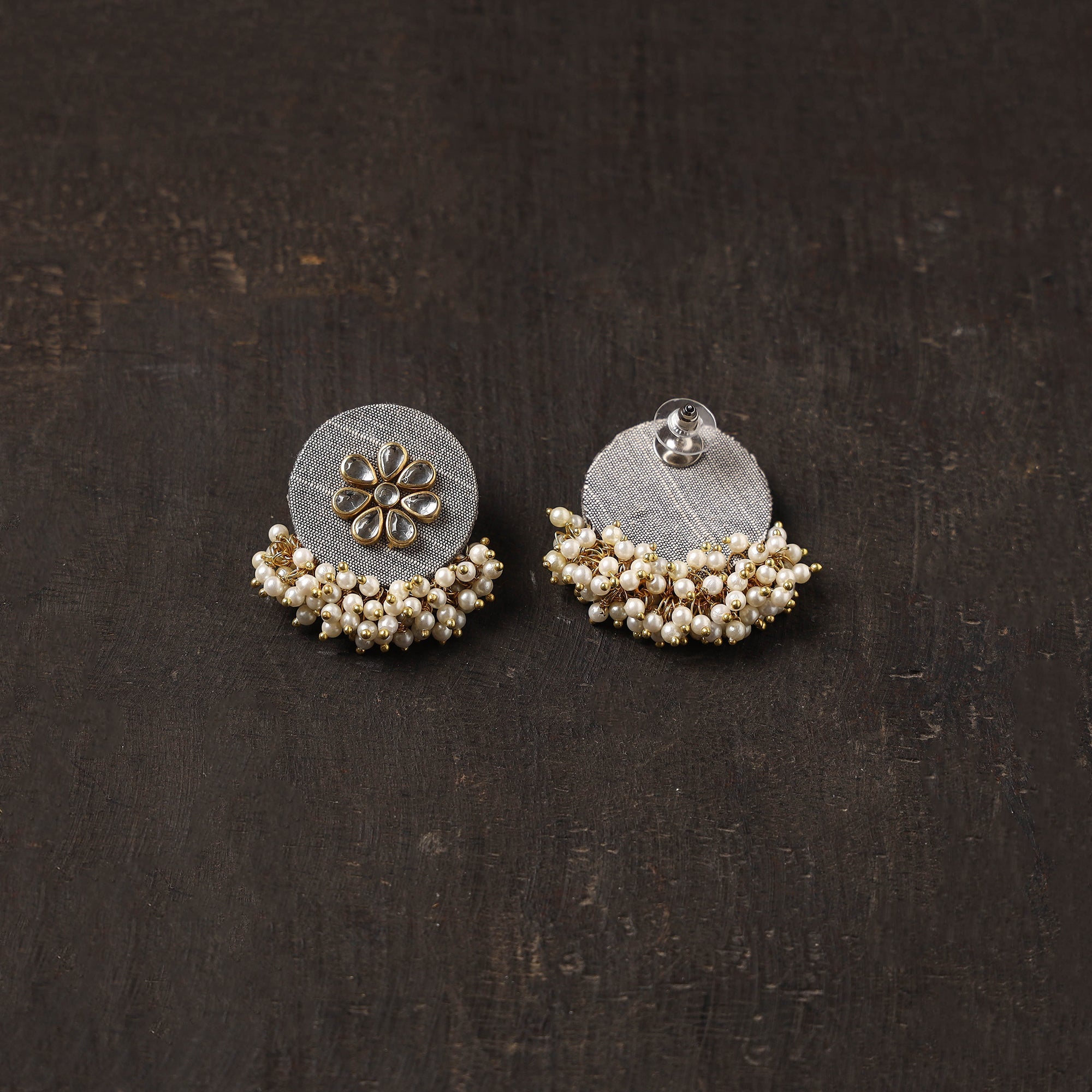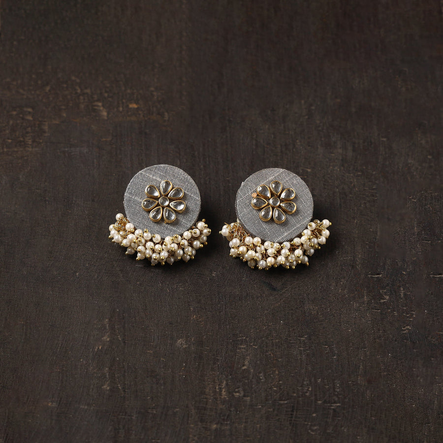 Handcrafted grey fabric earrings are beautifully detailed with kundan work and delicate beads. Made by skilled women artisans, they offer a lightweight and perfect for adding a unique charm to festive and everyday looks.