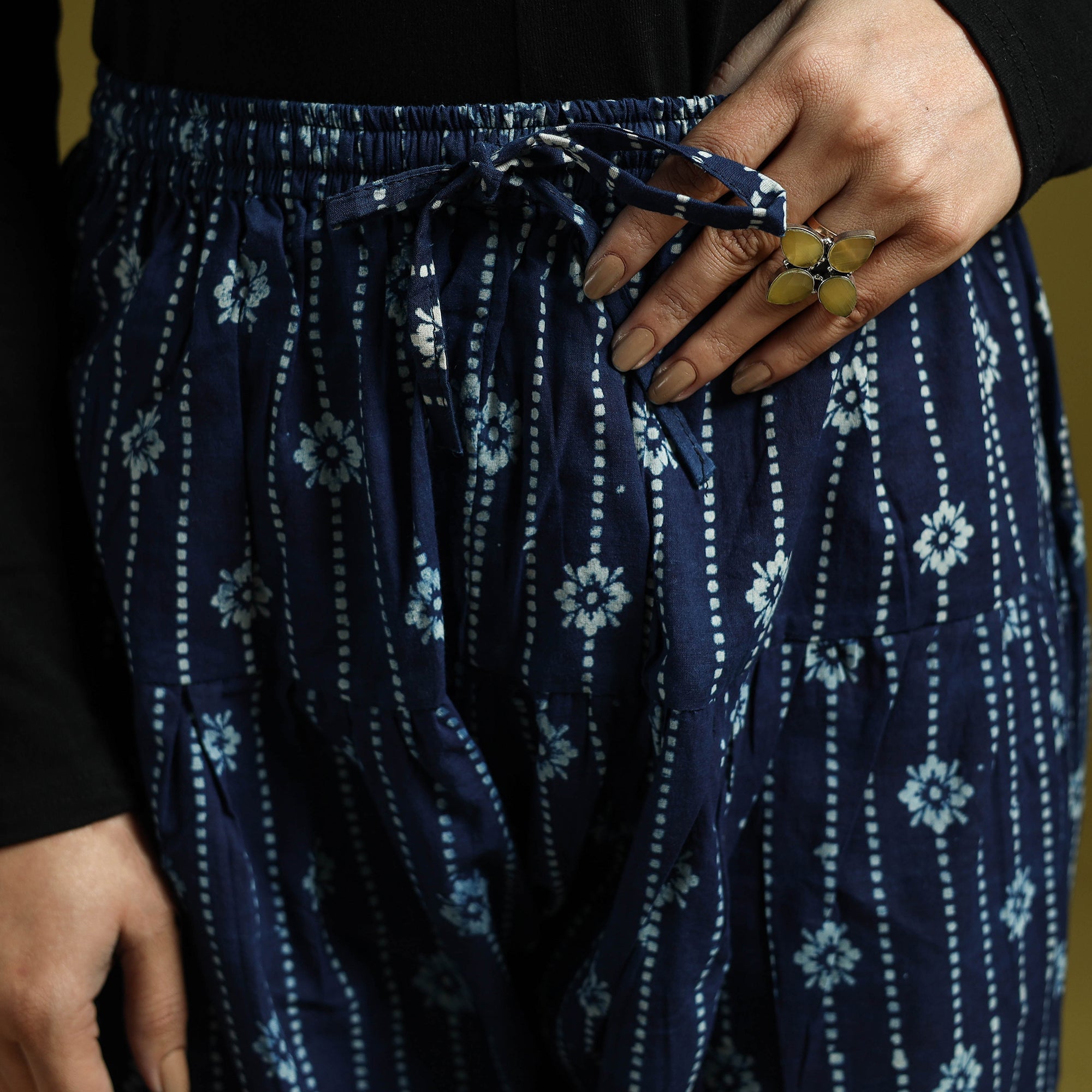Add a touch of traditional charm to your wardrobe with this blue indigo bagru print women’s salwar from Rajasthan, Bagru printing is known for its hand block designs and rich earthy tones created using natural dyes. The cotton fabric, elasticated waist with drawstring and side pocket ensure all-day comfort and practicality. Pair it with kurtas for a relaxed yet elegant look.