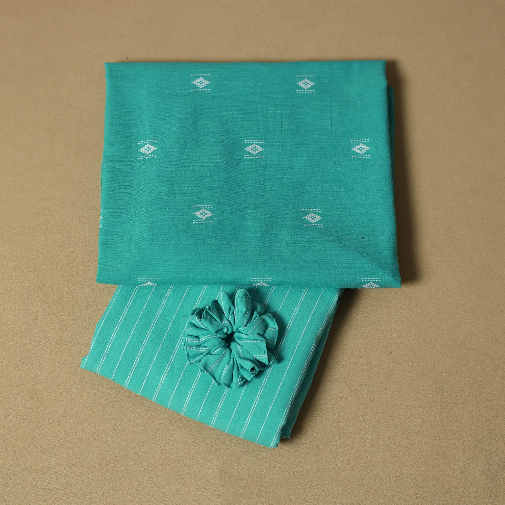 Pure cotton 2pc unstitched dress material is made using the jacquard weaving method where thread patterns are formed directly on the loom to create a textured design. The set includes kurta fabric and bottom fabric, along with matching handmade rubber band/scrunchie that adds a coordinated look. Easy to stitch and comfortable to wear, this set works well for daily wear and casual outings.