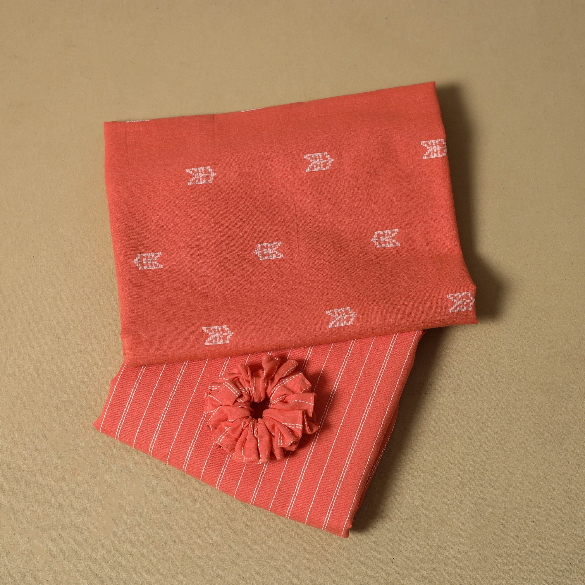 Pure cotton 2pc unstitched dress material is made using the jacquard weaving method where thread patterns are formed directly on the loom to create a textured design. The set includes kurta fabric and bottom fabric, along with matching handmade rubber band/scrunchie that adds a coordinated look. Easy to stitch and comfortable to wear, this set works well for daily wear and casual outings.