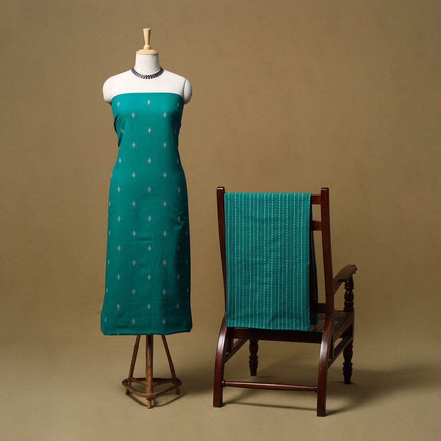 Pure cotton 2pc unstitched dress material is made using the jacquard weaving method where thread patterns are formed directly on the loom to create a textured design. The set includes kurta fabric and bottom fabric, along with matching handmade rubber band/scrunchie that adds a coordinated look. Easy to stitch and comfortable to wear, this set works well for daily wear and casual outings.