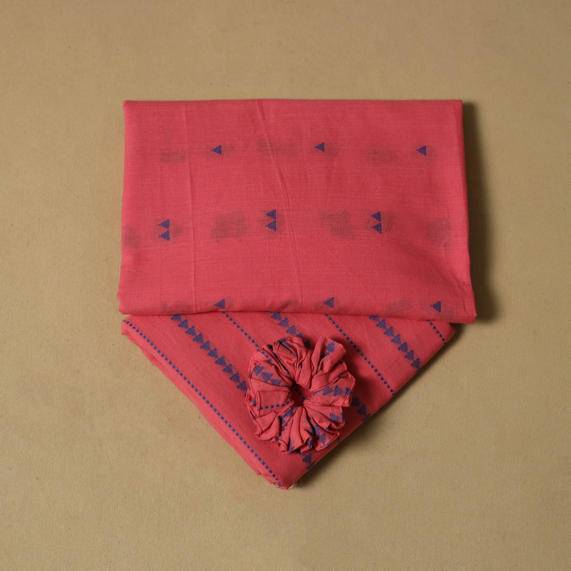 Pure cotton 2pc unstitched dress material is made using the jacquard weaving method where thread patterns are formed directly on the loom to create a textured design. The set includes kurta fabric and bottom fabric, along with matching handmade rubber band/scrunchie that adds a coordinated look. Easy to stitch and comfortable to wear, this set works well for daily wear and casual outings.