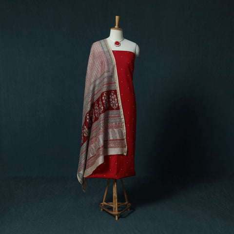 | Material | Jacquard cotton 2pc unstitched dress material kurta set is made using a jacquard loom, where the design is woven into the fabric. This process creates beautiful patterns with a slightly raised texture that looks rich and detailed. This is a machine-made kurta material with no or limited handmade processes involved. It is paired with a bagh hand block print chanderi silk dupatta. This set also comes with handcrafted matching necklace and earrings to complete your look. It is suitable for festive gatherings, family functions, casual outing, and everyday wear. Note: This piece carries tiny knots, thread pulls or uneven lines not flaws but fingerprints. Every irregularity is a whisper from the hands that made it. It’s what happens when tradition weaves through time, not machines. If you’re looking for perfection, this isn’t it. But if you’re looking for soul you’ve found it. |