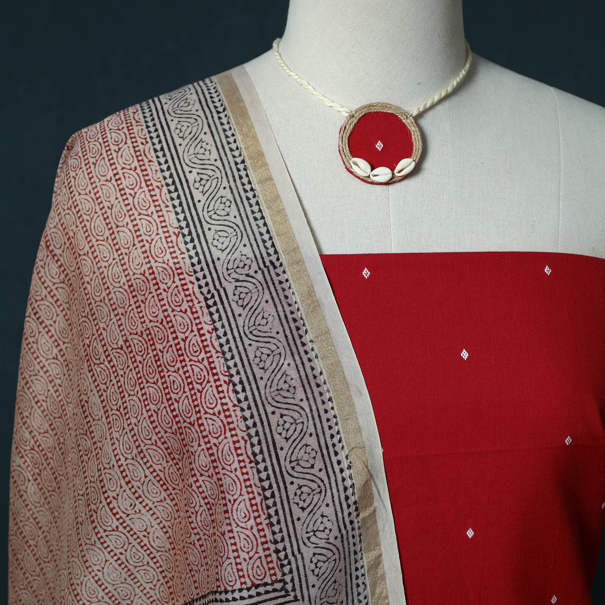 Jacquard cotton 2pc dress material with bagh hand block print dupatta and matching jewellery.