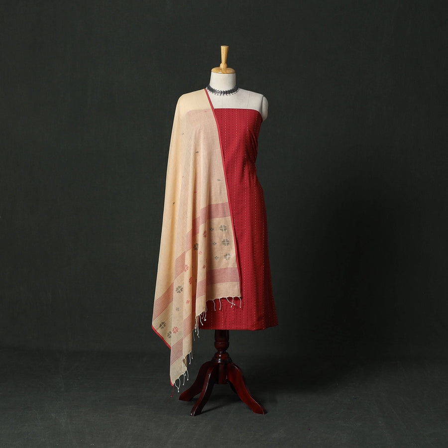 Jacquard cotton 2pc unstitched dress material is made using a jacquard loom, where the design is woven into the fabric. This process creates beautiful patterns with a slightly raised texture that looks rich and detailed. Paired with jamdani handloom dupatta, this set also comes with handcrafted matching earrings to complete your look. Suitable for traditional events, celebrations and daily wear.