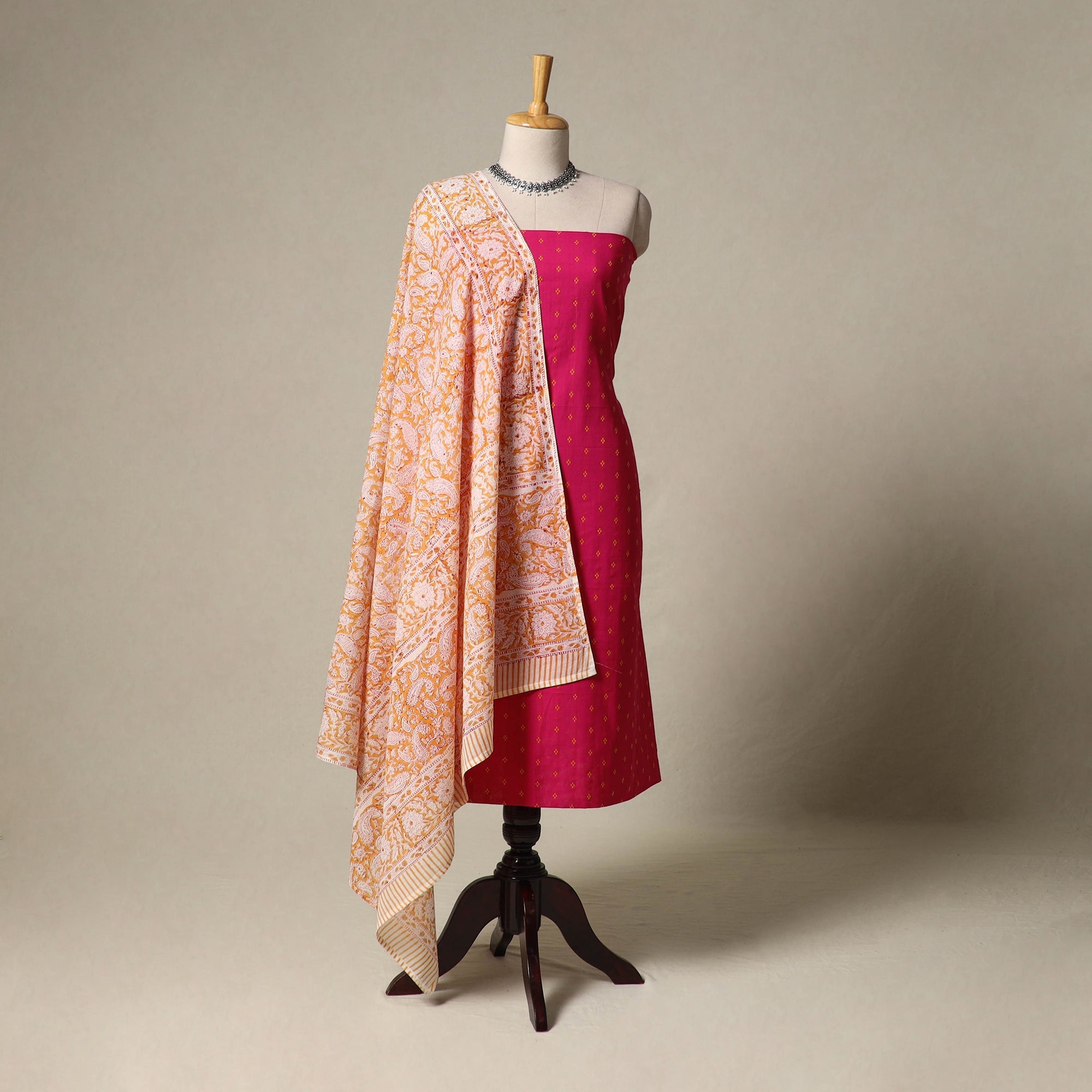 | Material | Jacquard pure cotton 2pc unstitched dress material is made using a jacquard loom, where the design is woven into the fabric. This process creates beautiful patterns with a slightly raised texture that looks rich and detailed. Paired with sanganeri hand block print dupatta, this set also comes with handcrafted matching earrings to complete your look. making it suitable for traditional events, celebrations and daily wear. Note: This piece carries tiny knots, thread pulls or uneven lines not flaws but fingerprints. Every irregularity is a whisper from the hands that made it. It’s what happens when tradition weaves through time, not machines. If you’re looking for perfection, this isn’t it. But if you’re looking for soul you’ve found it. |