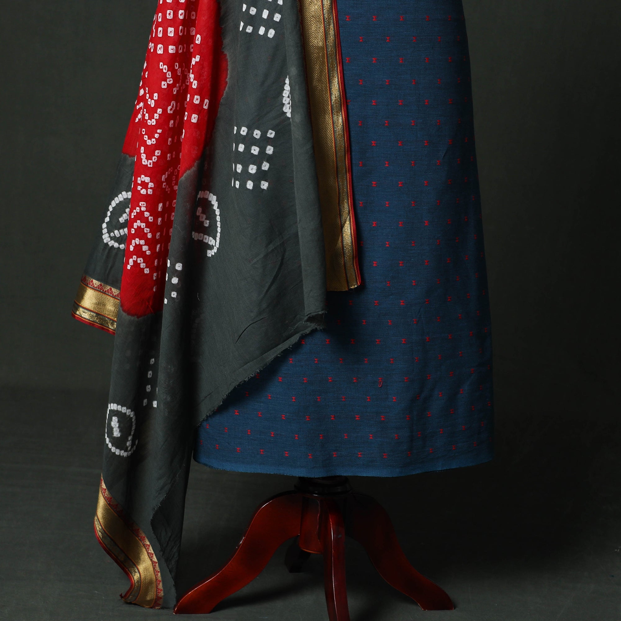 Jacquard cotton 2pc unstitched dress material is made using a jacquard loom, where the design is woven into the fabric. This process creates beautiful patterns with a slightly raised texture that looks rich and detailed. Paired with bandhani tie-dye dupatta, this set also comes with handcrafted matching earrings to complete your look. making it suitable for traditional events, celebrations and daily wear.