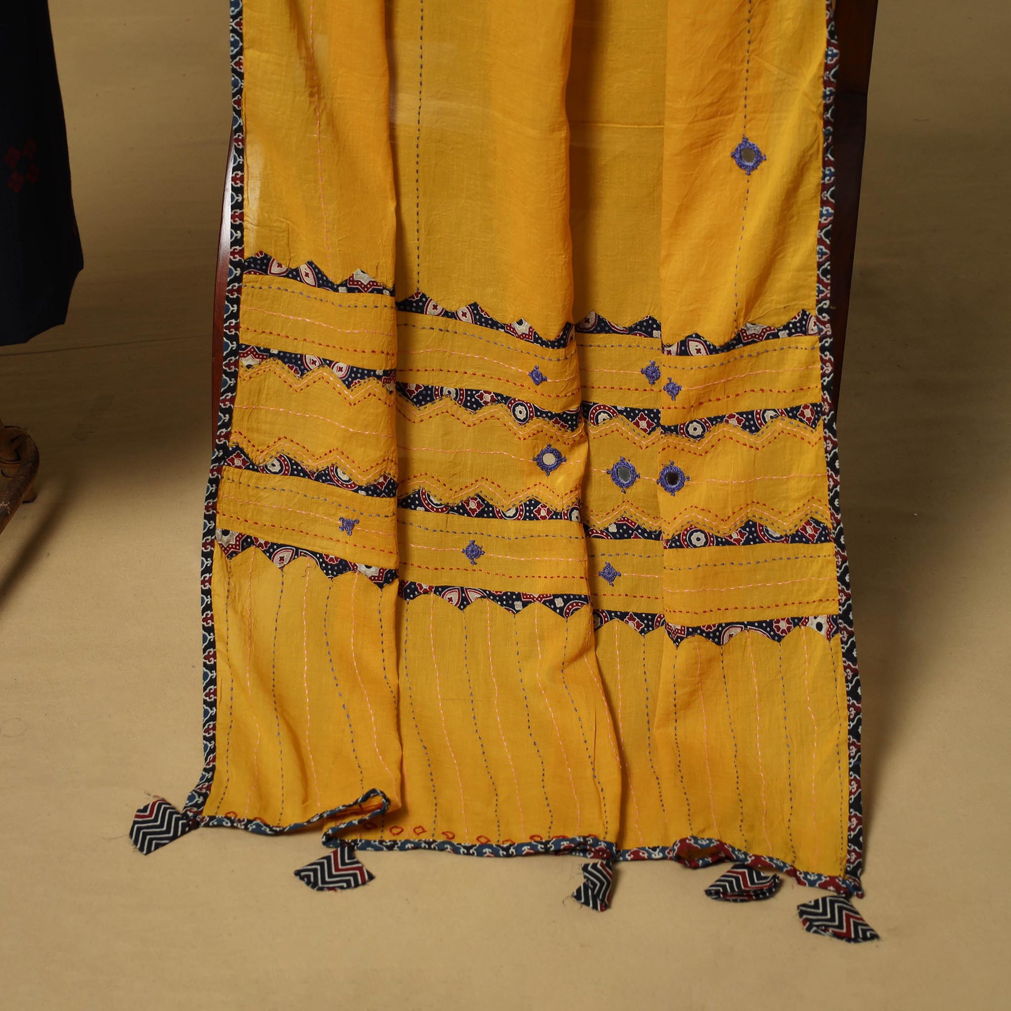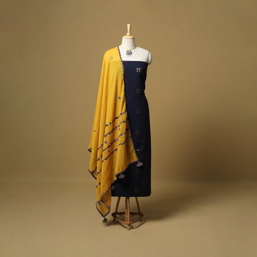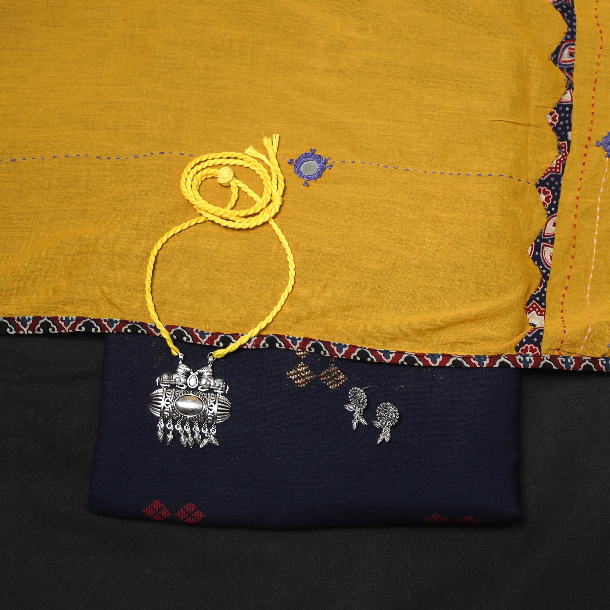 2pc unstitched dress material set features a jacquard weave cotton kurta fabric, perfect for everyday elegance. It comes paired with a cotton ajrakh applique work tagai dupatta that adds soft texture and grace. Completing the set is a handcrafted necklace with matching earrings, making it a ready-to-style ensemble for effortless ethnic wear.