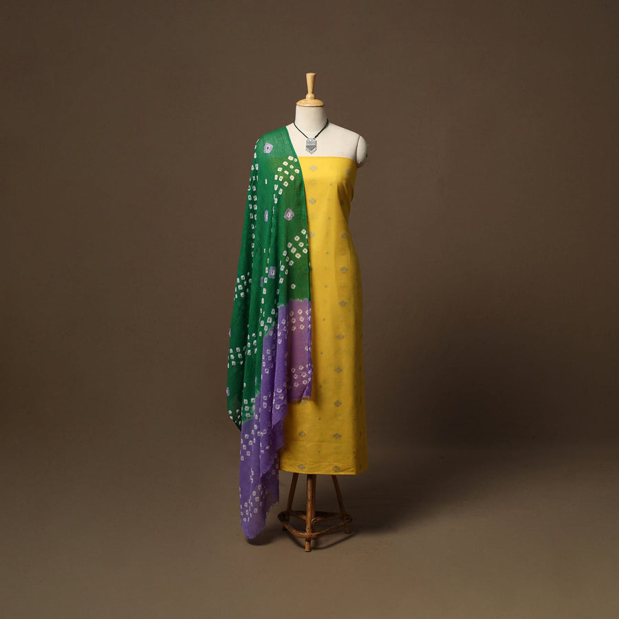 Pure cotton 2pc unstitched dress material set features jacquard woven kurta fabric where patterns are created directly during the weaving process. It is paired with bandhani tie-dye dupatta. The set also includes a handcrafted necklace and matching earrings.