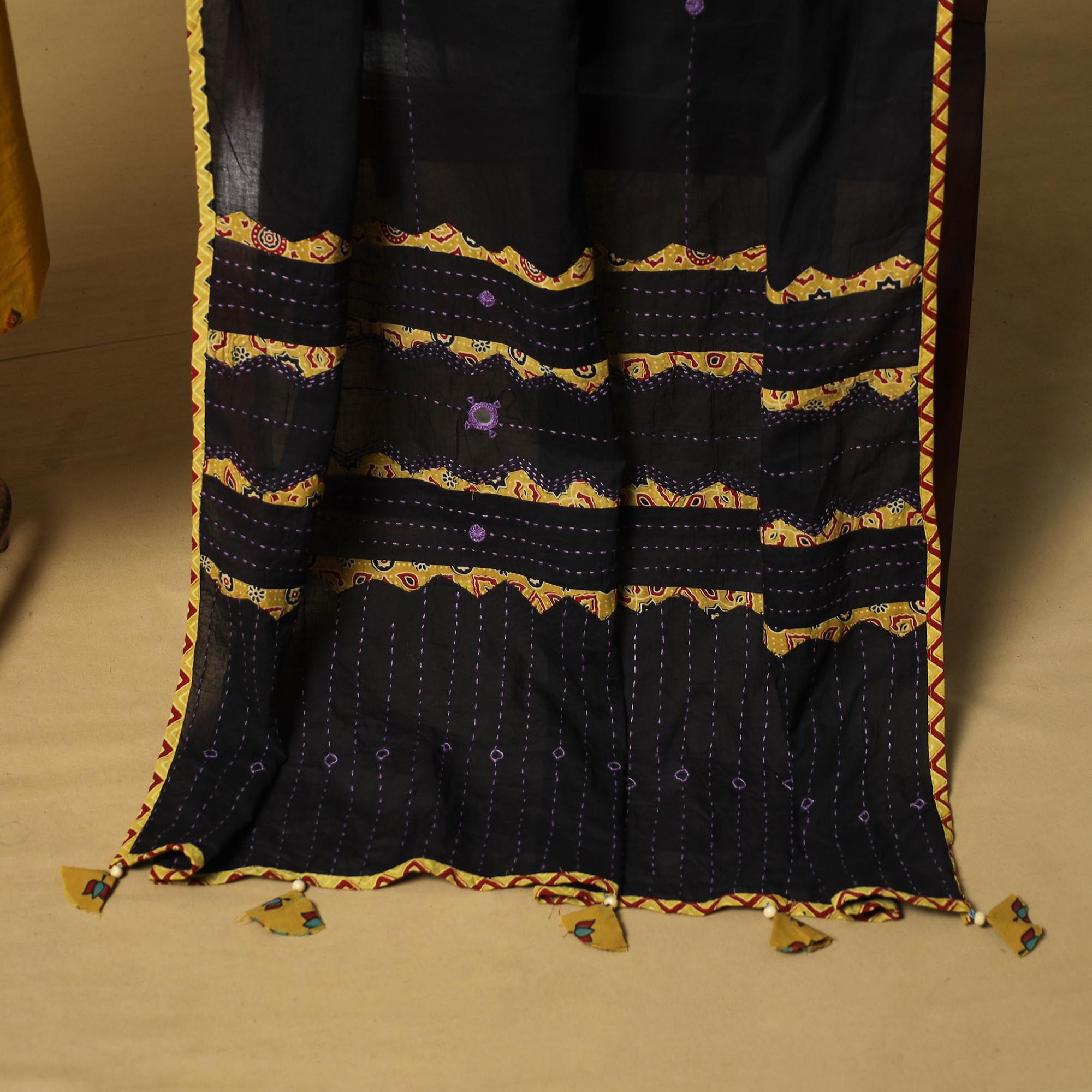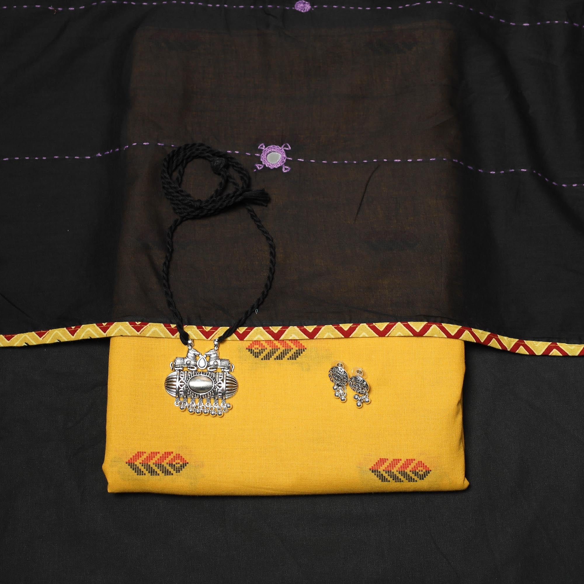 2pc unstitched dress material set features a jacquard weave cotton kurta fabric, perfect for everyday elegance. It comes paired with a cotton ajrakh applique work tagai dupatta that adds soft texture and grace. Completing the set is a handcrafted necklace with matching earrings, making it a ready-to-style ensemble for effortless ethnic wear.
