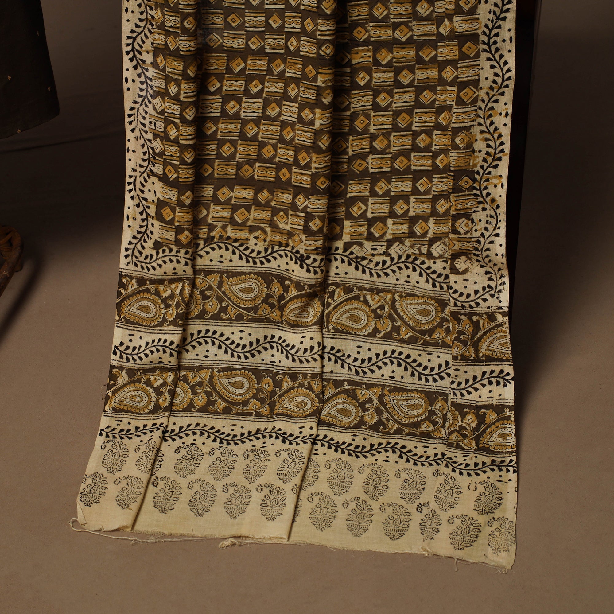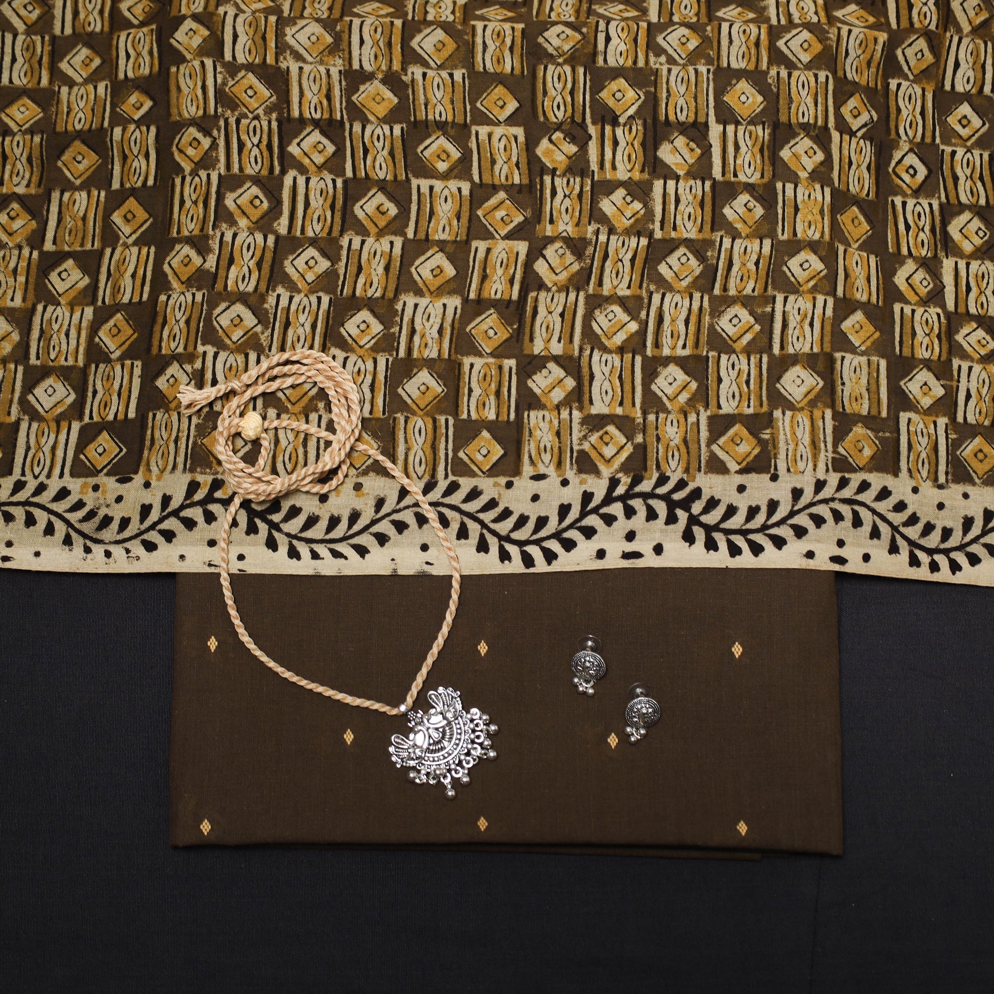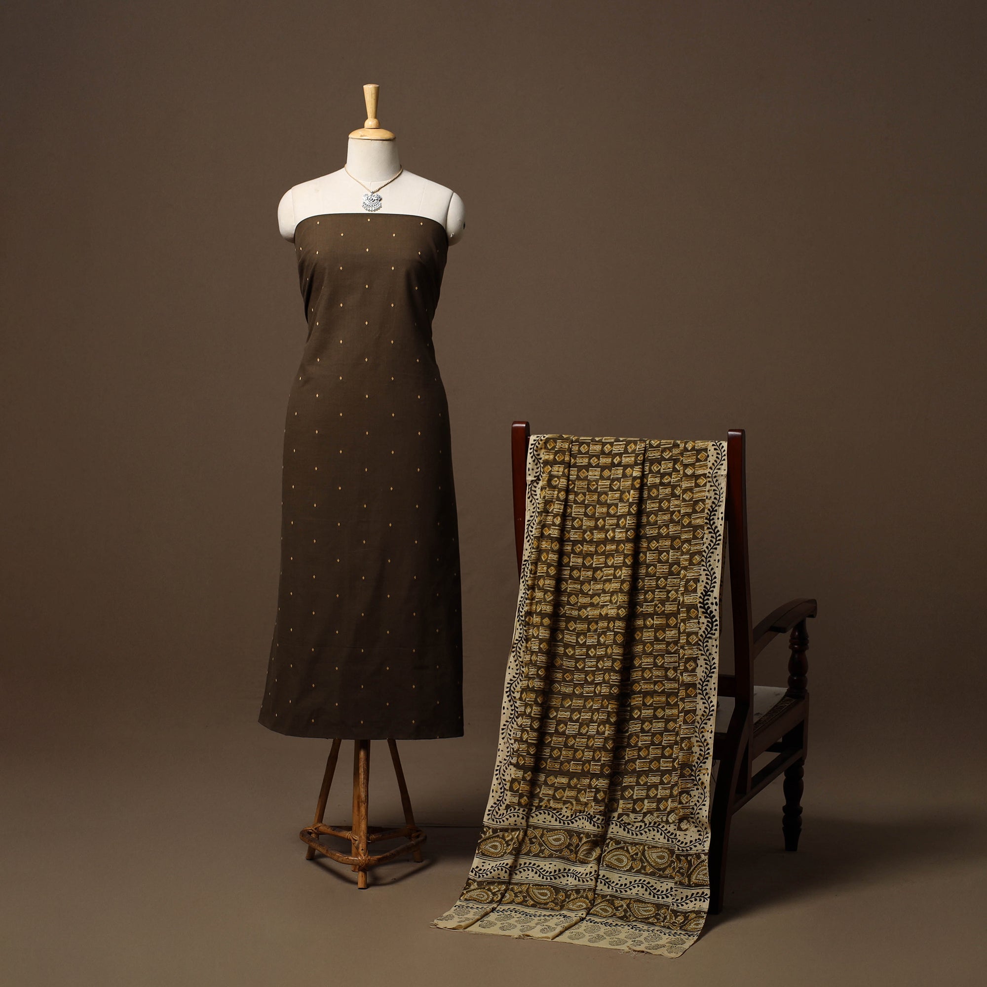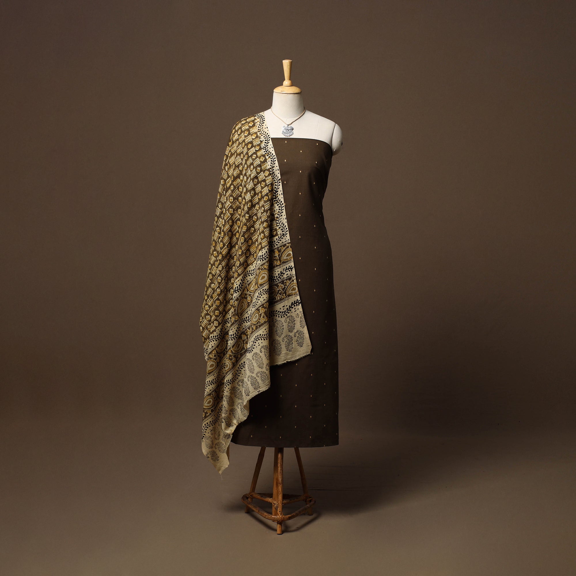 Pure cotton 2pc unstitched dress material set features jacquard woven kurta fabric where patterns are created directly during the weaving process. It is paired with kalamkari printed dupatta. The set also includes a handcrafted necklace and matching earrings.