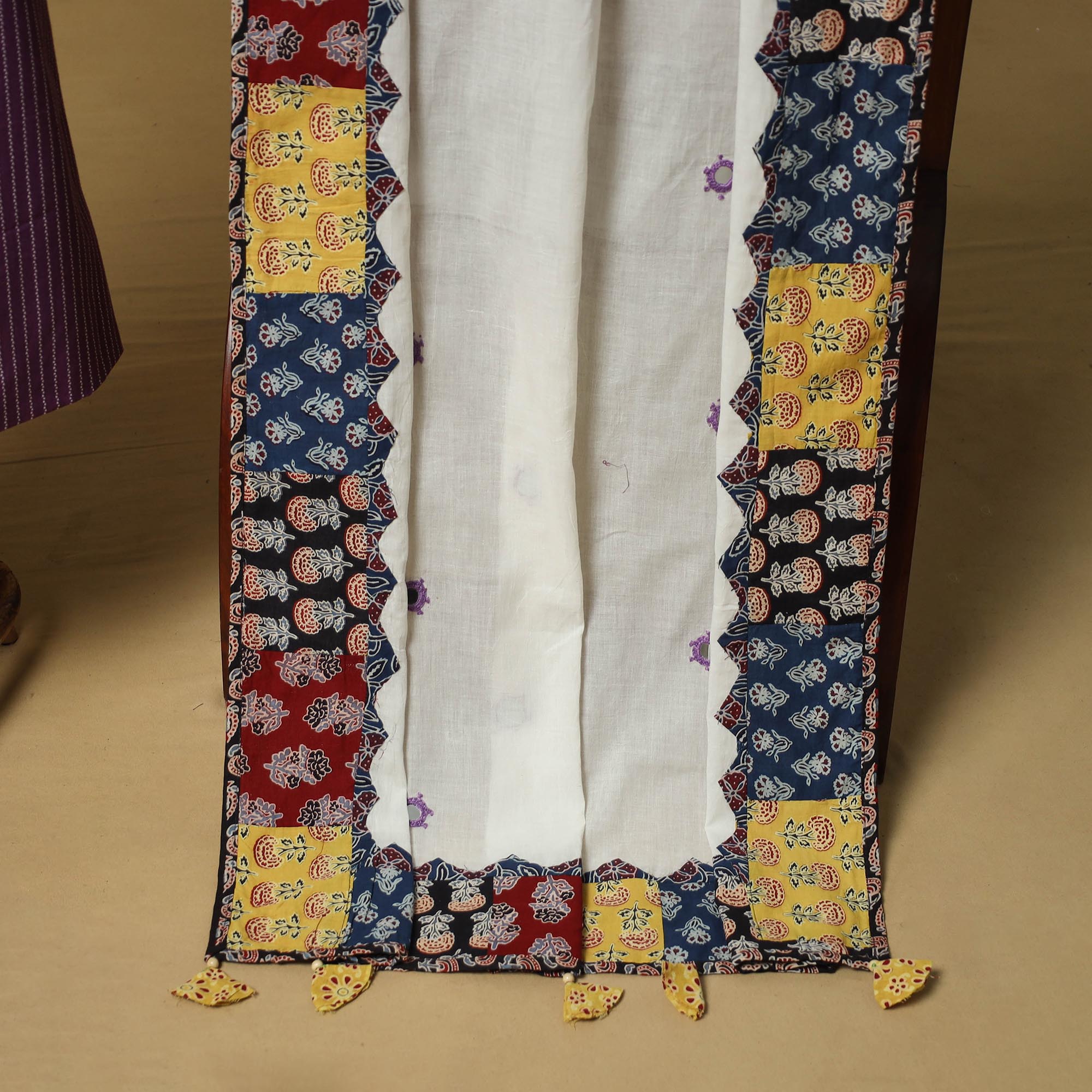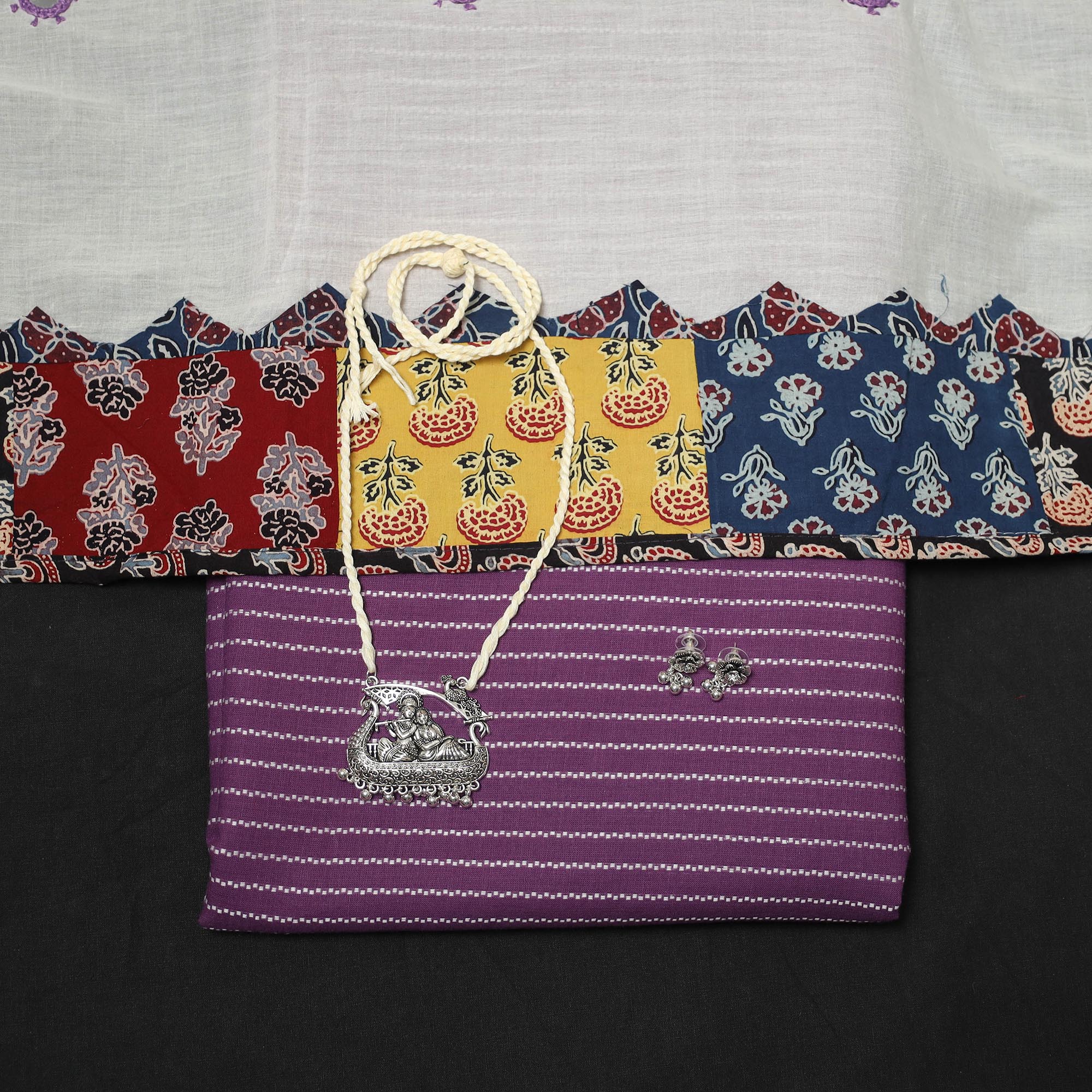 2pc unstitched dress material set features a jacquard weave cotton kurta fabric, perfect for everyday elegance. It comes paired with a cotton ajrakh applique work tagai dupatta that adds soft texture and grace. Completing the set is a handcrafted necklace with matching earrings, making it a ready-to-style ensemble for effortless ethnic wear.