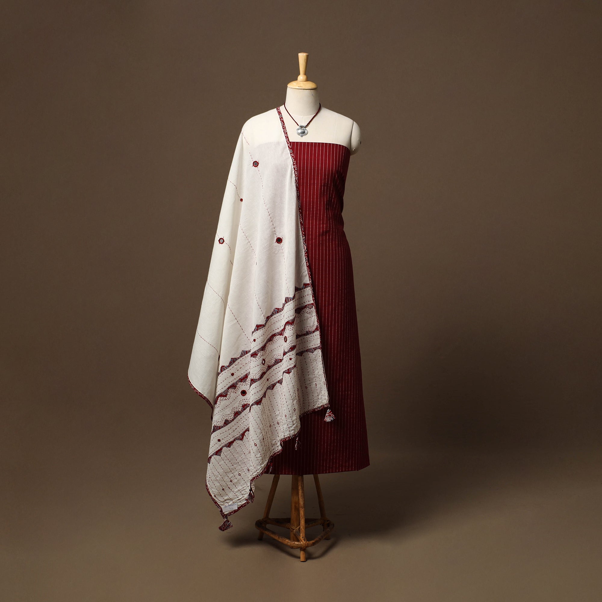 2pc unstitched dress material set features a jacquard weave cotton kurta fabric, perfect for everyday elegance. It comes paired with a cotton ajrakh applique work tagai dupatta that adds soft texture and grace. Completing the set is a handcrafted necklace with matching earrings, making it a ready-to-style ensemble for effortless ethnic wear.