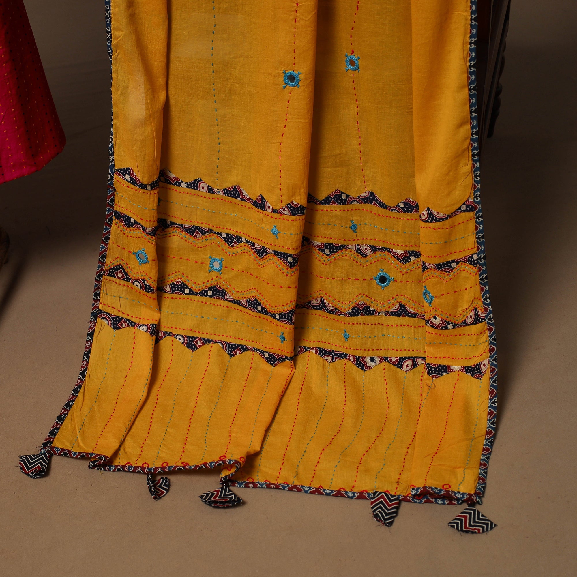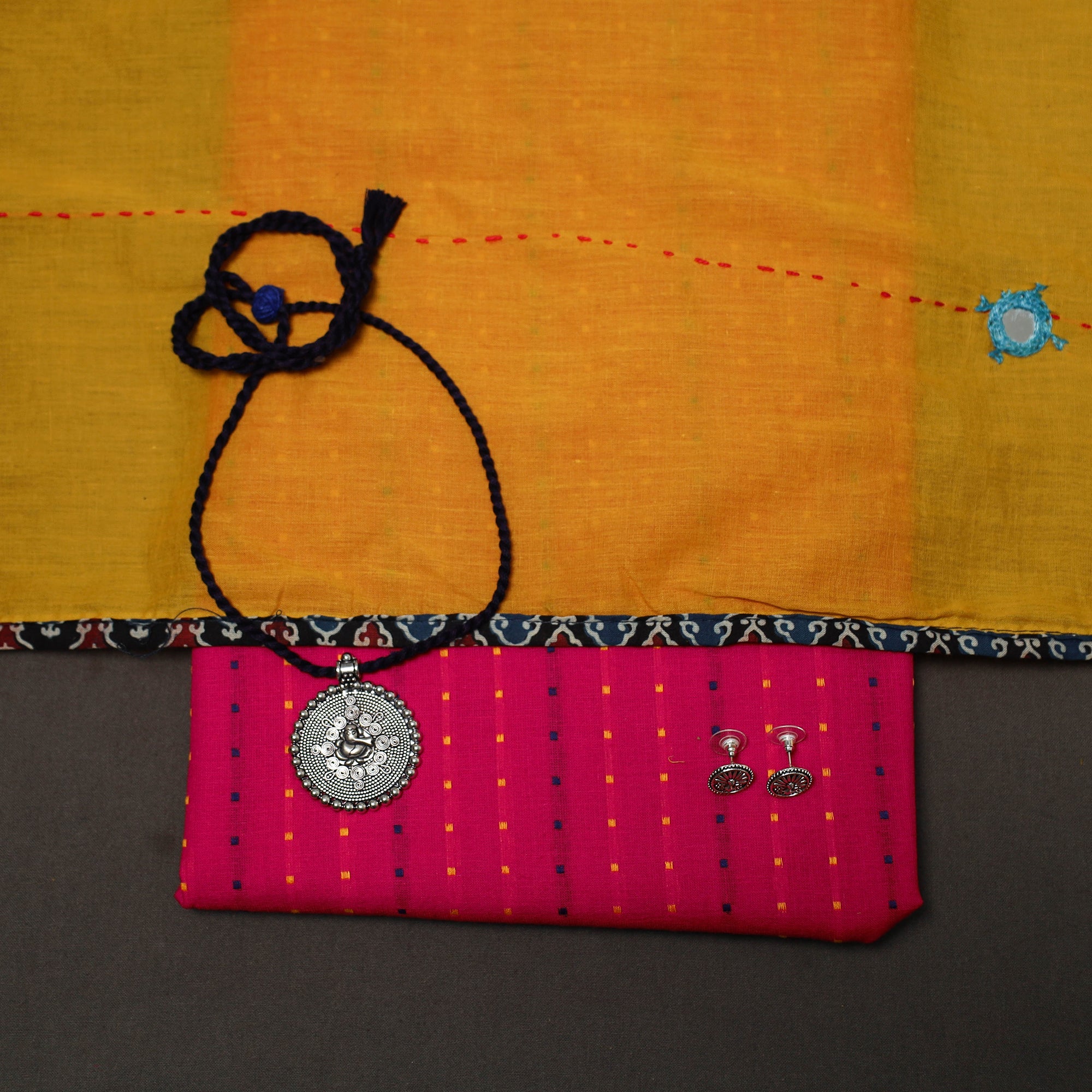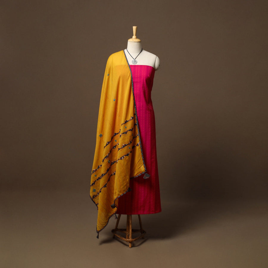 2pc unstitched dress material set features a jacquard weave cotton kurta fabric, perfect for everyday elegance. It comes paired with a cotton ajrakh applique work tagai dupatta that adds soft texture and grace. Completing the set is a handcrafted necklace with matching earrings, making it a ready-to-style ensemble for effortless ethnic wear.