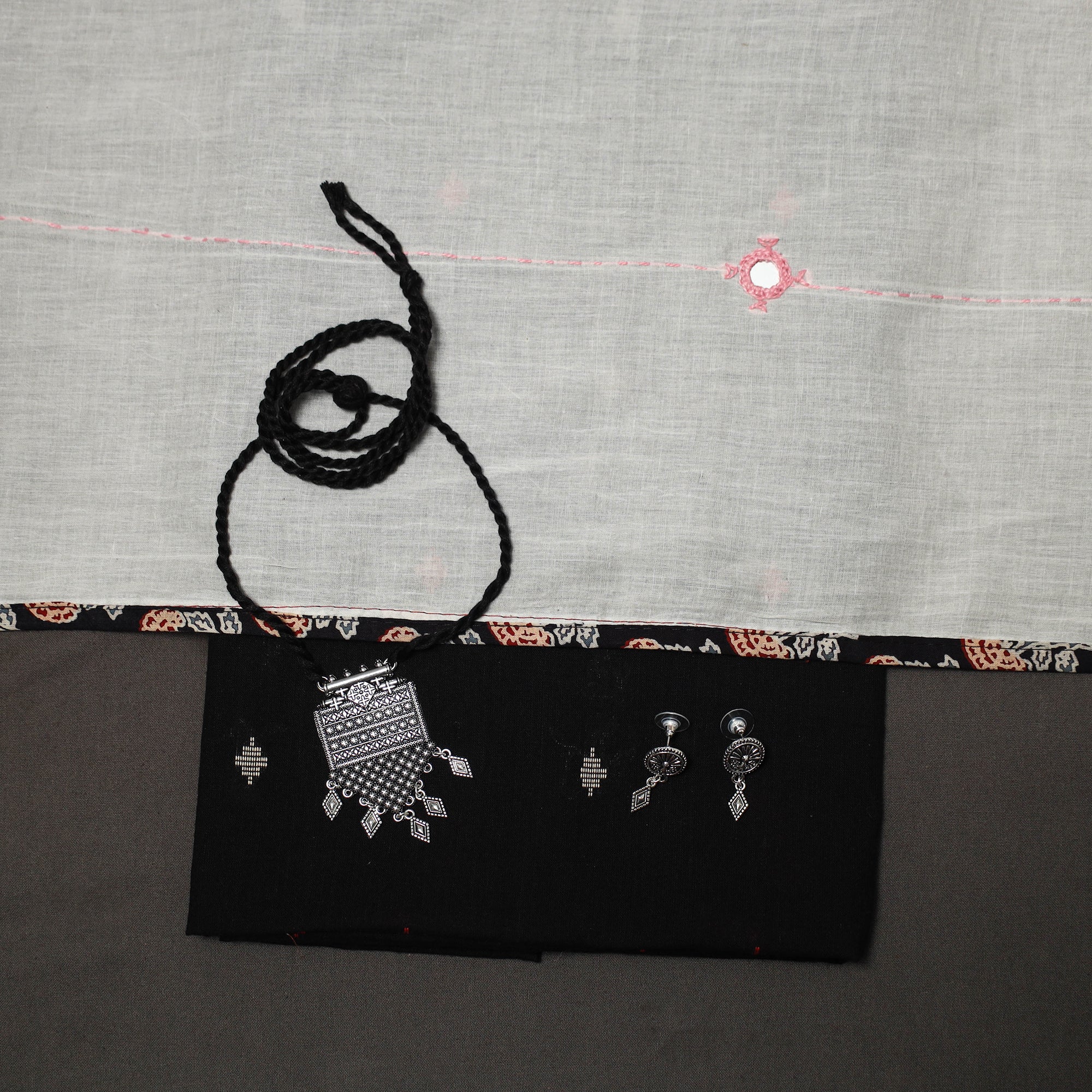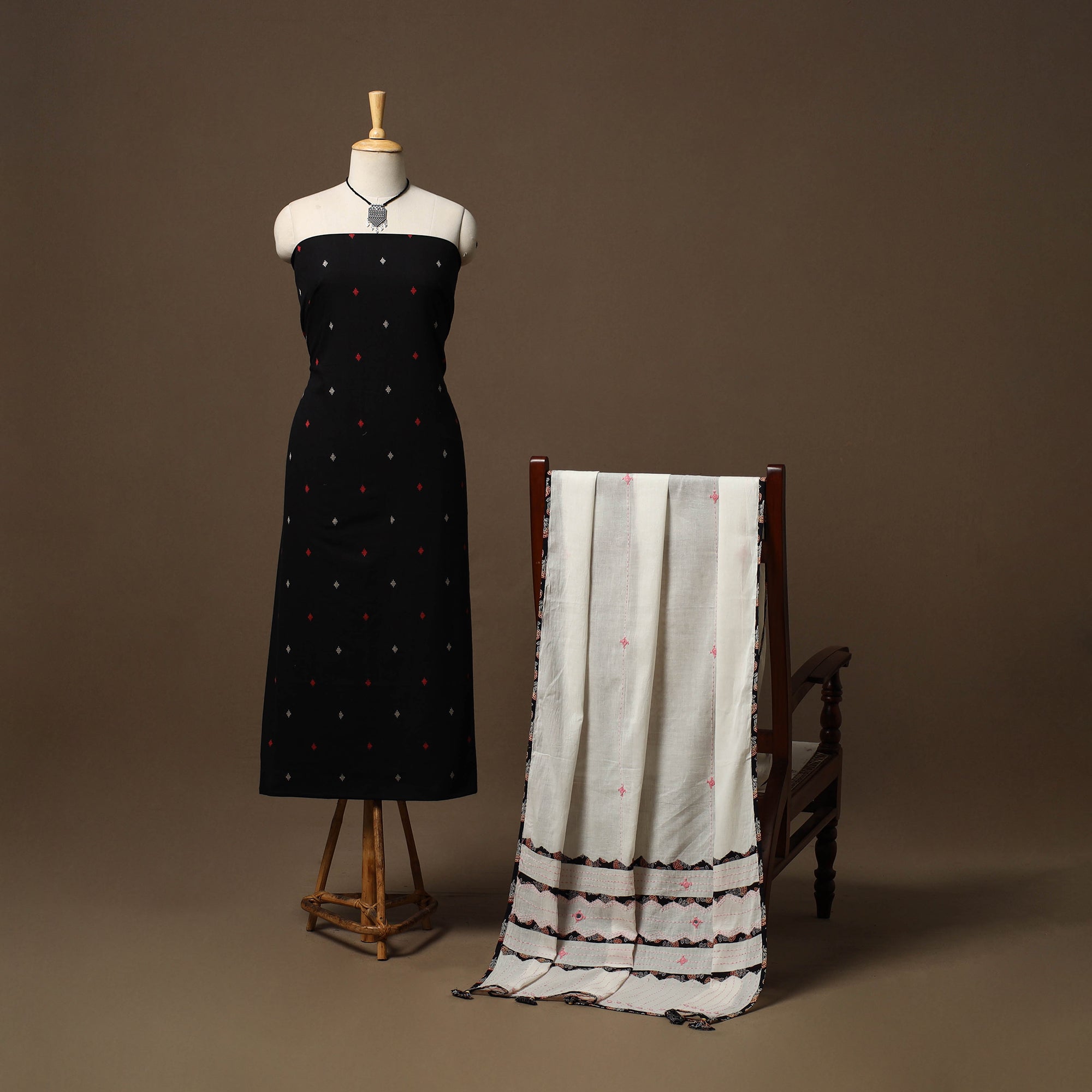 2pc unstitched dress material set features a jacquard weave cotton kurta fabric, perfect for everyday elegance. It comes paired with a cotton ajrakh applique work tagai dupatta that adds soft texture and grace. Completing the set is a handcrafted necklace with matching earrings, making it a ready-to-style ensemble for effortless ethnic wear.