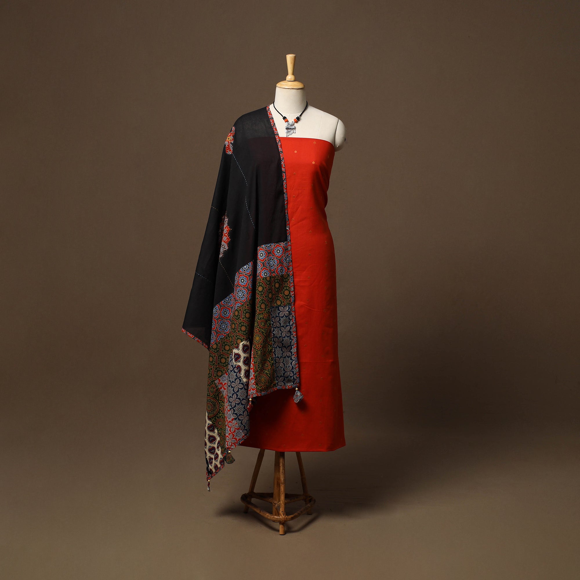 2pc unstitched dress material set features a jacquard weave cotton kurta fabric, perfect for everyday elegance. It comes paired with a cotton ajrakh applique work tagai dupatta that adds soft texture and grace. Completing the set is a handcrafted necklace with matching earrings, making it a ready-to-style ensemble for effortless ethnic wear.