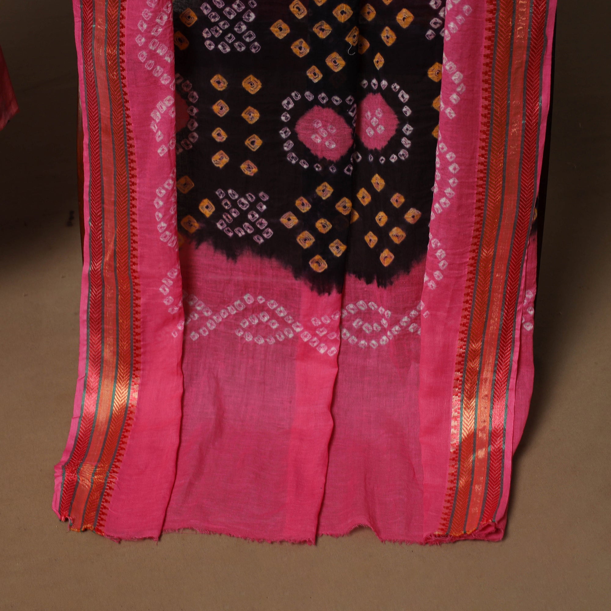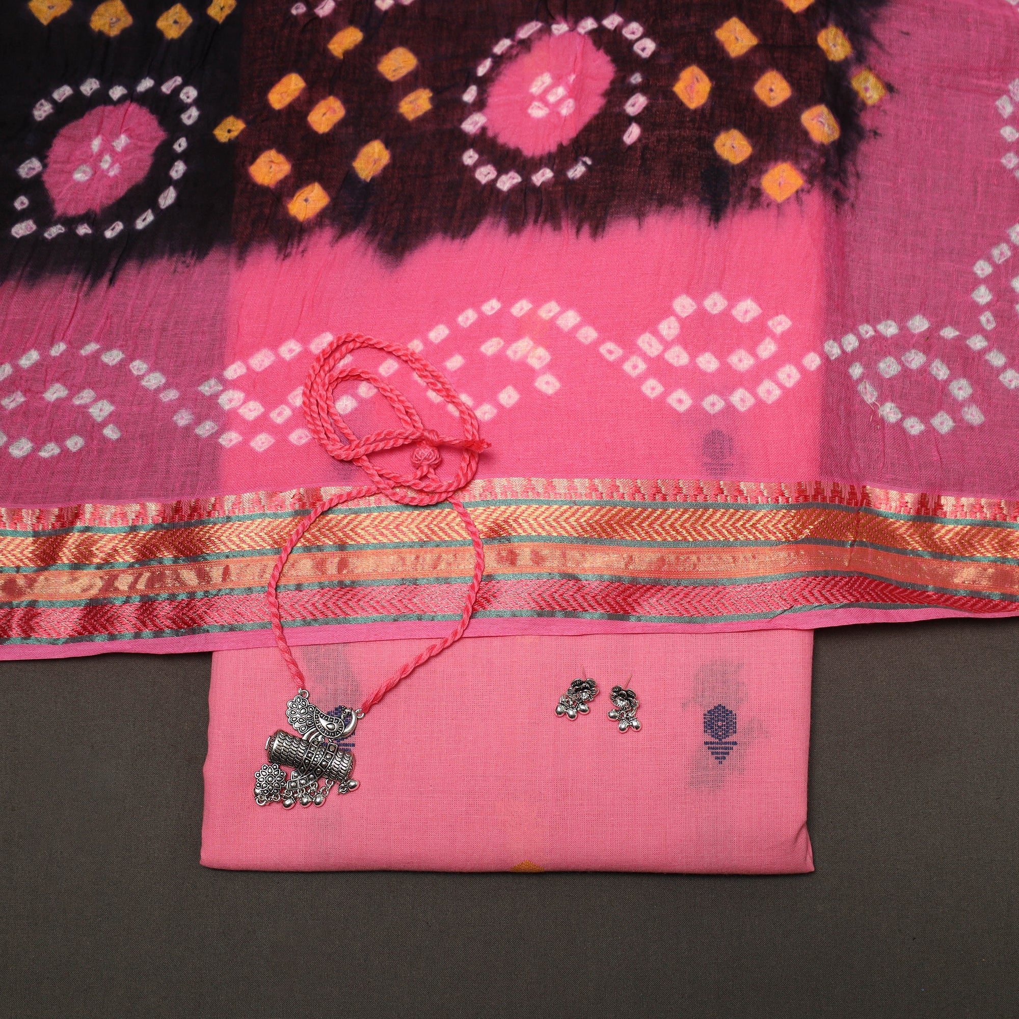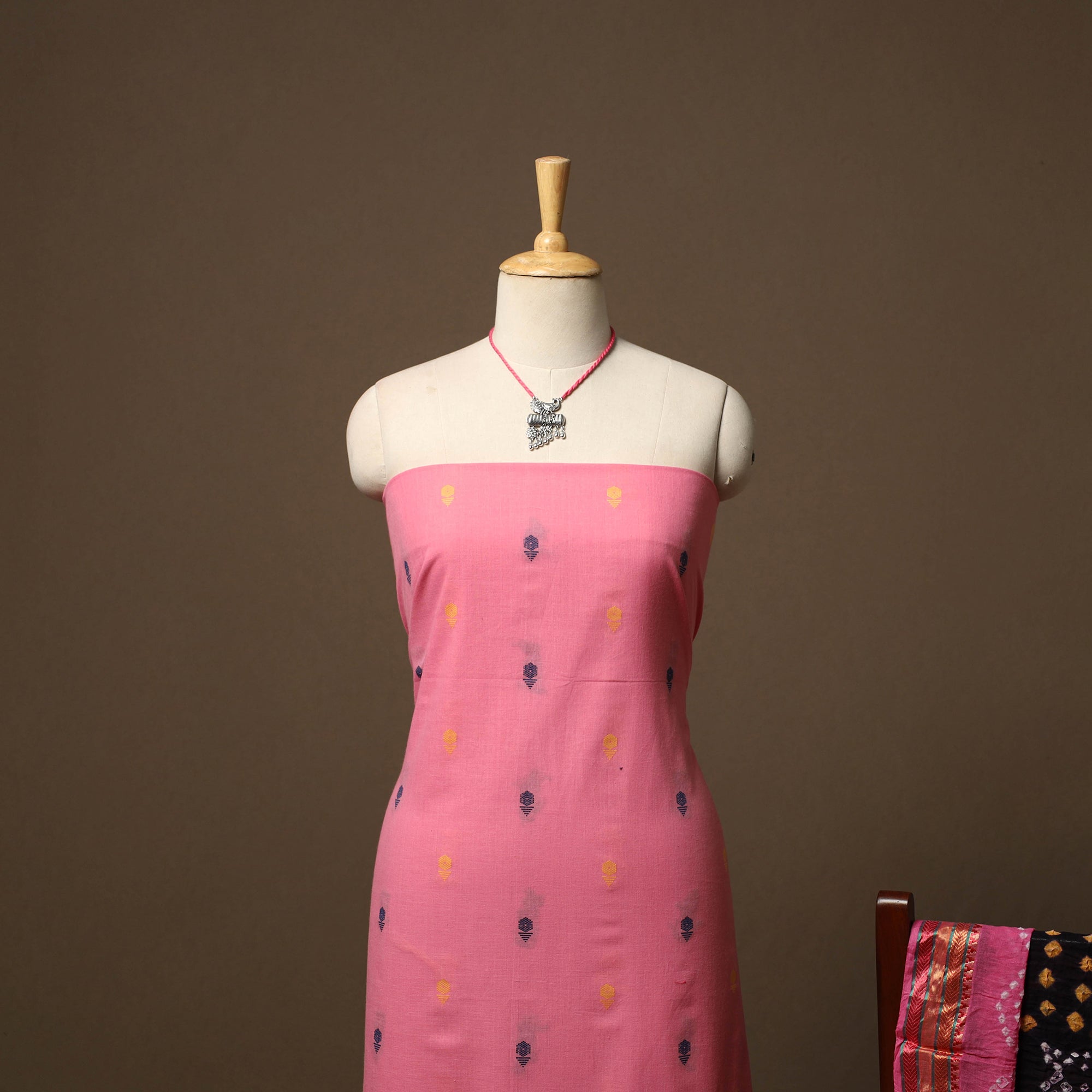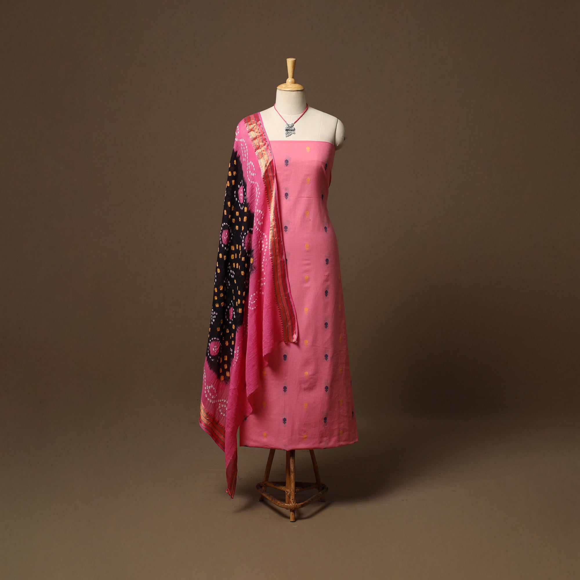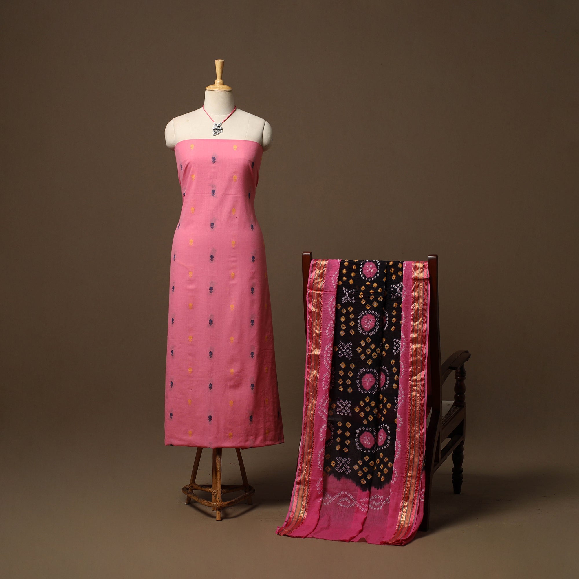 Pure cotton 2pc unstitched dress material set features jacquard woven kurta fabric where patterns are created directly during the weaving process. It is paired with bandhani tie-dye dupatta. The set also includes a handcrafted necklace and matching earrings.