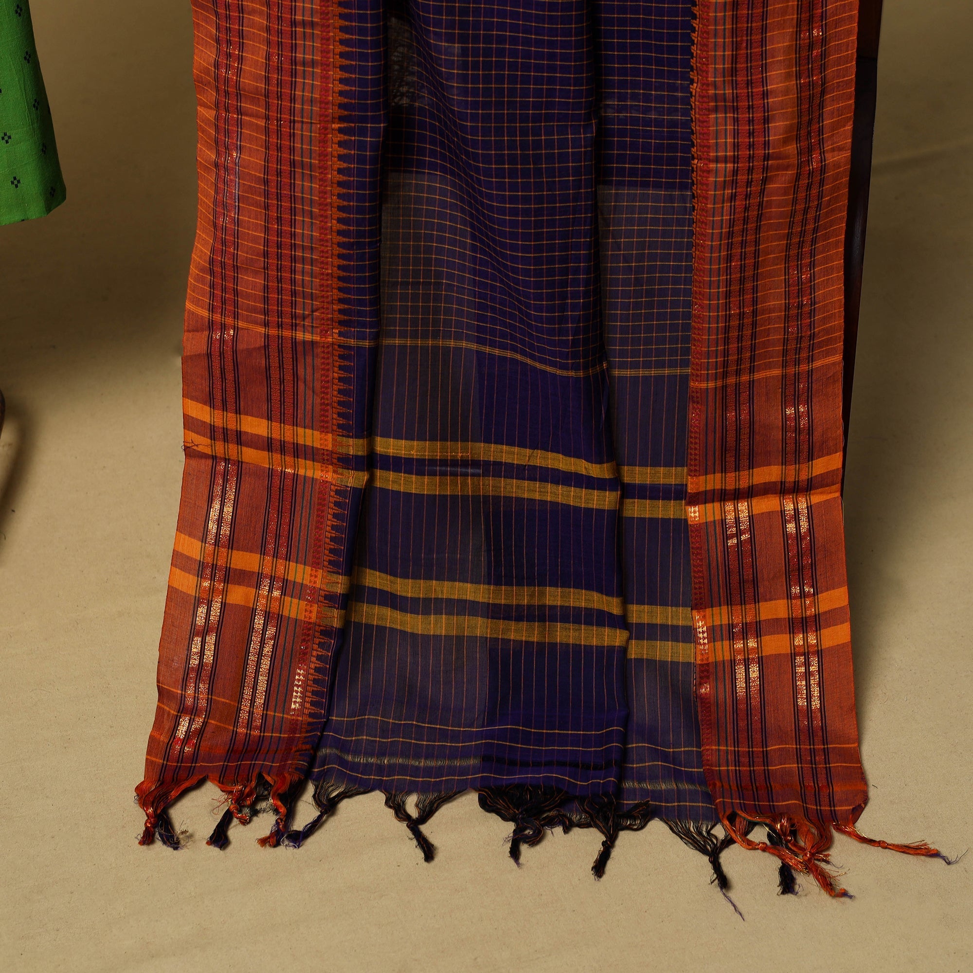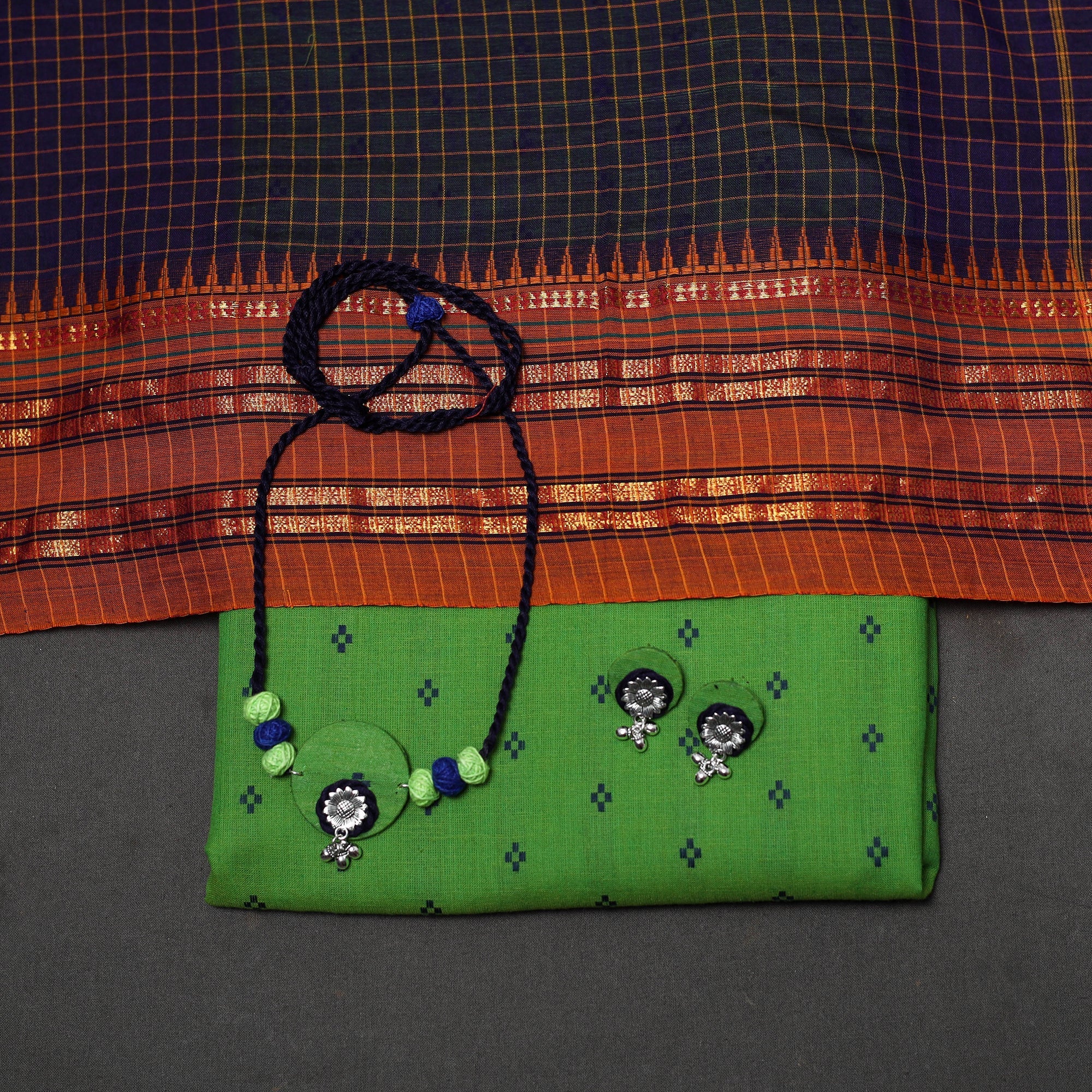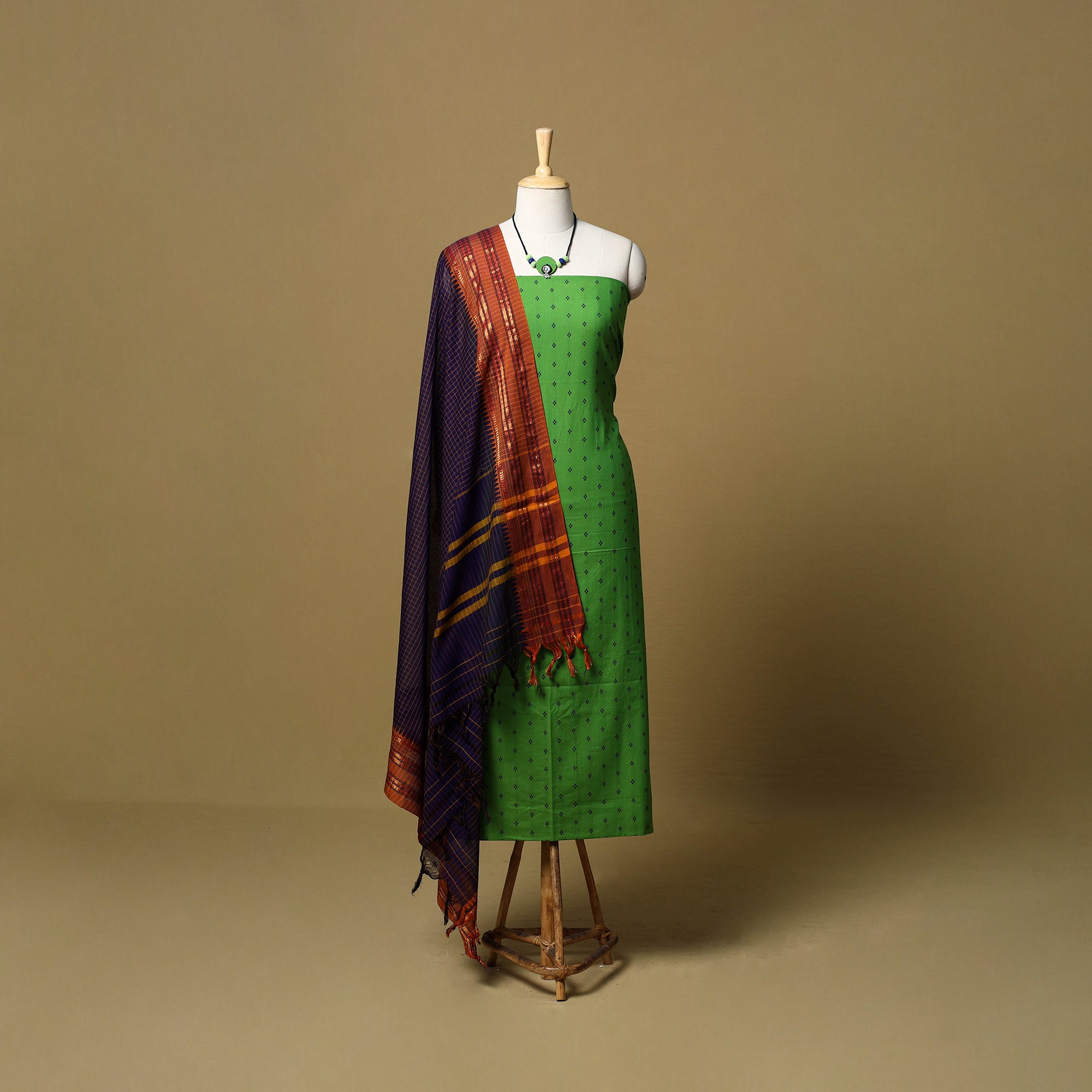 Green 2pc cotton unstitched dress material set features a jacquard woven kurta fabric, created using a loom technique that produces intricate, textured patterns directly in the weave. It is paired with a dharwad woven border dupatta. The set also includes a handcrafted necklace and matching earrings, making it perfect for festive events, family gatherings, special occasions or even as a thoughtful gift.