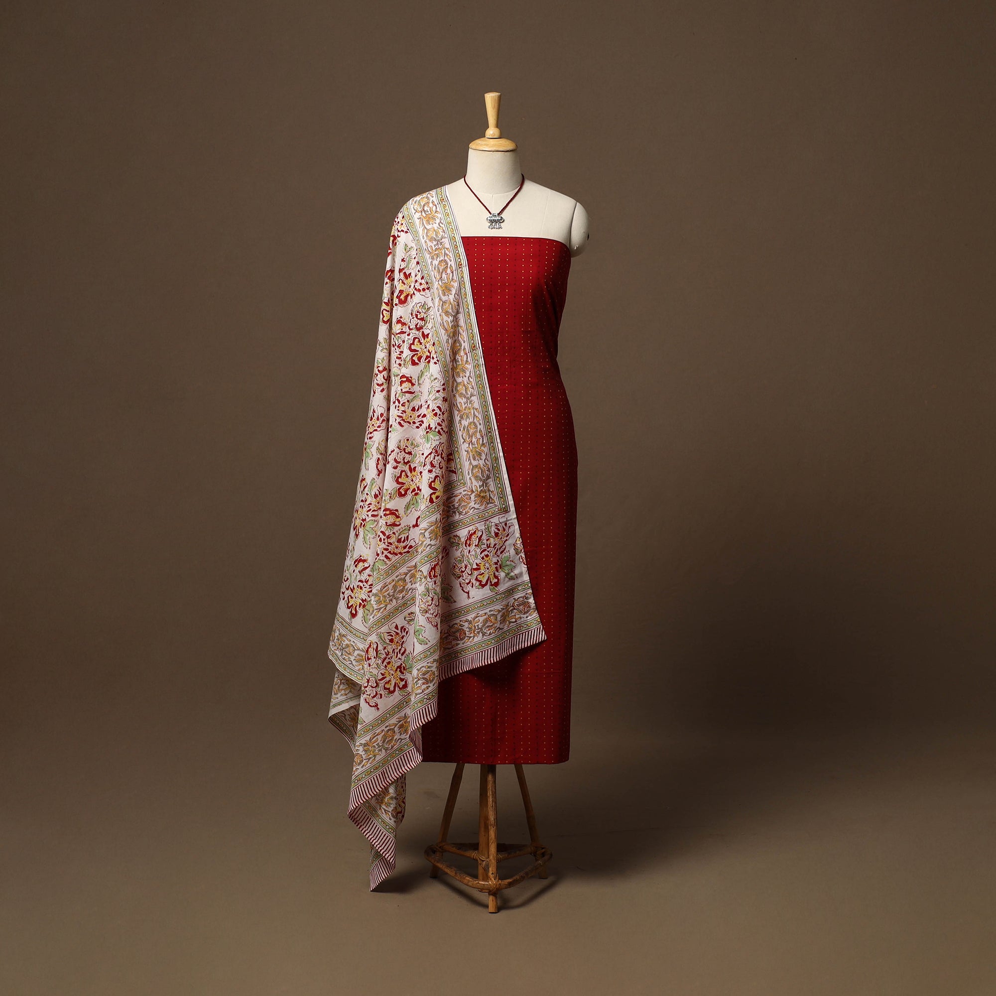 2pc unstitched dress material set features a jacquard weave cotton kurta fabric, perfect for everyday elegance. It comes paired with a cotton sanganeri block print dupatta that adds soft texture and grace. Completing the set is a handcrafted necklace with matching earrings, making it a ready-to-style ensemble for effortless ethnic wear.