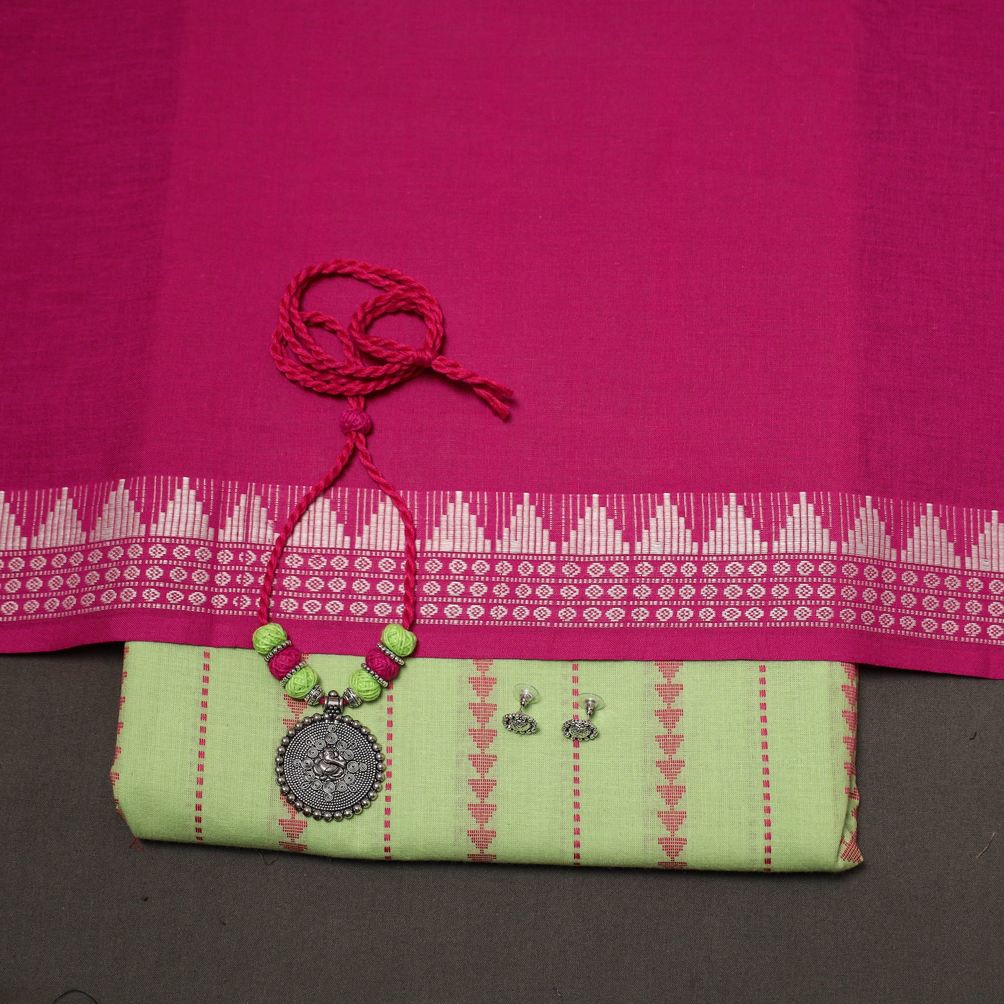 Pure cotton 2pc unstitched dress material set features jacquard woven kurta fabric where patterns are created directly during the weaving process. It is paired with sambalpuri dupatta. The set also includes a handcrafted necklace and matching earrings.