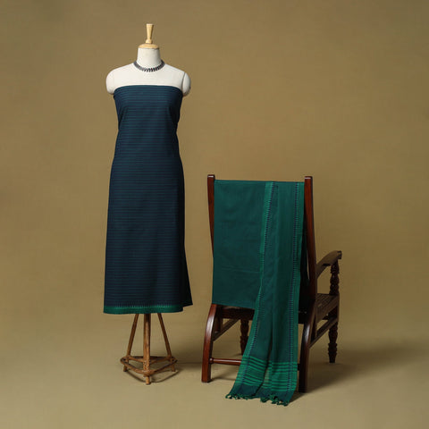 Blue pure cotton jacquard 3pc unstitched dress material set from Tamil Nadu, where patterns are created directly during the weaving process. This set includes a beautifully woven kurta fabric, bottom fabric, and a matching dupatta. Easy to stitch and comfortable to wear, this set works well for daily wear and casual outings.