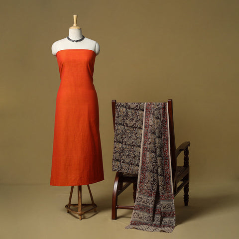 Pure cotton 3pc unstitched dress material set from Tamil Nadu features jacquard woven kurta fabric, where patterns are created directly during the weaving process. It is paired with kalamkari block printed bottom fabric and dupatta, made using hand carved wooden blocks. The combination of jacquard weaving and kalamkari printing brings together two textile techniques making this set unique. Easy to stitch and comfortable to wear, it works well for daily wear and casual outings.