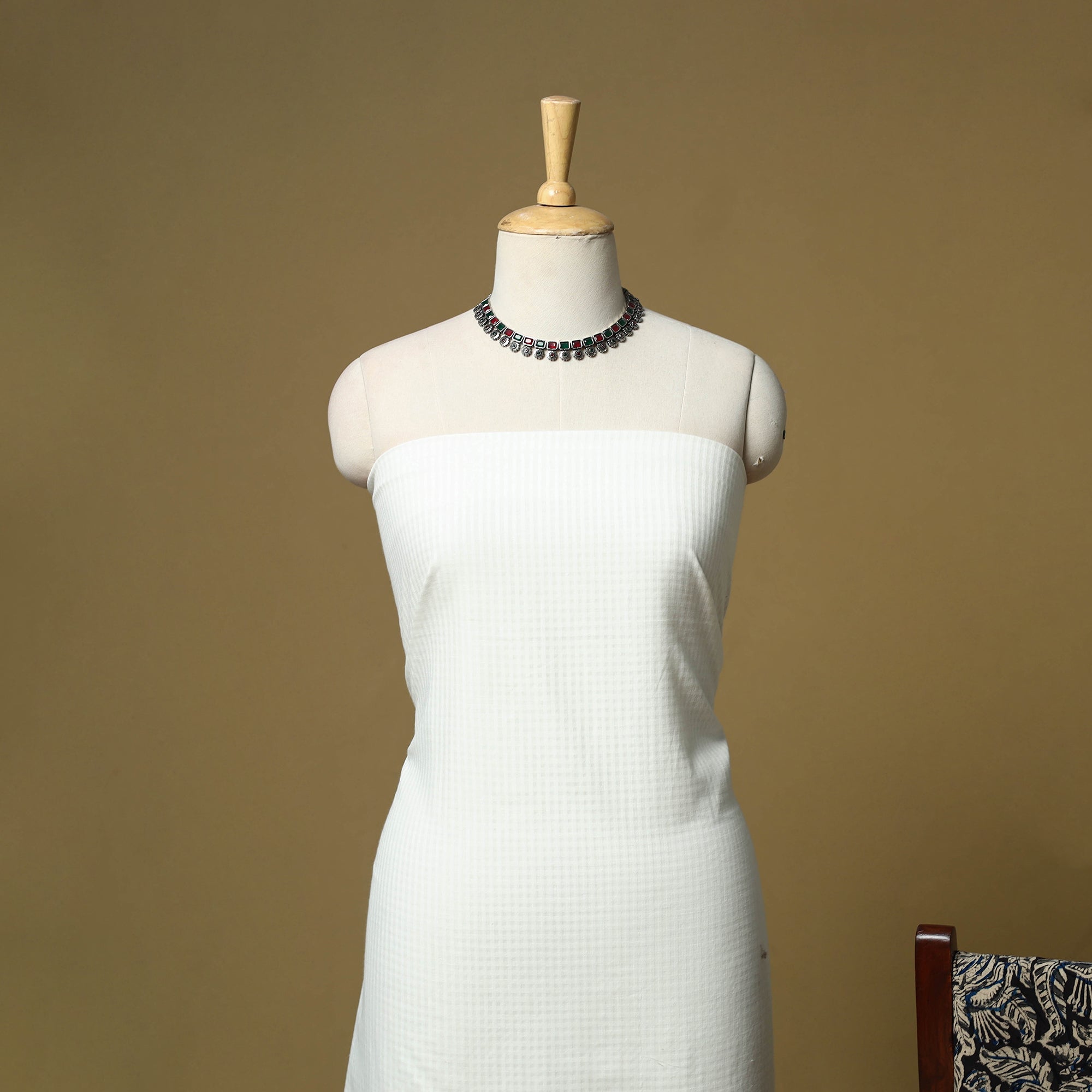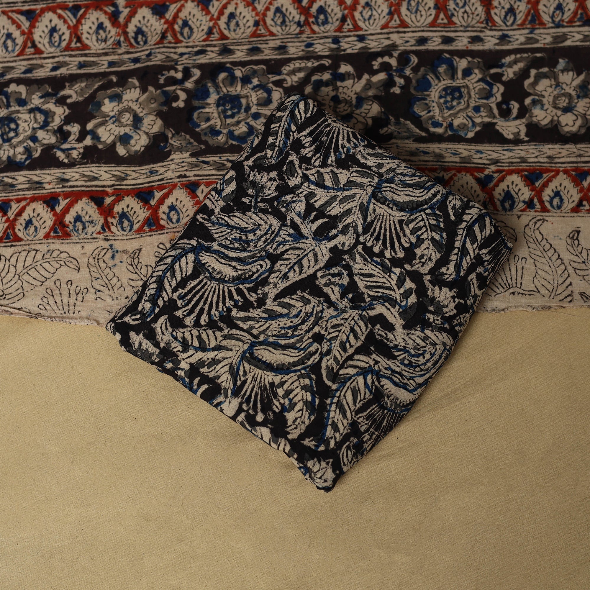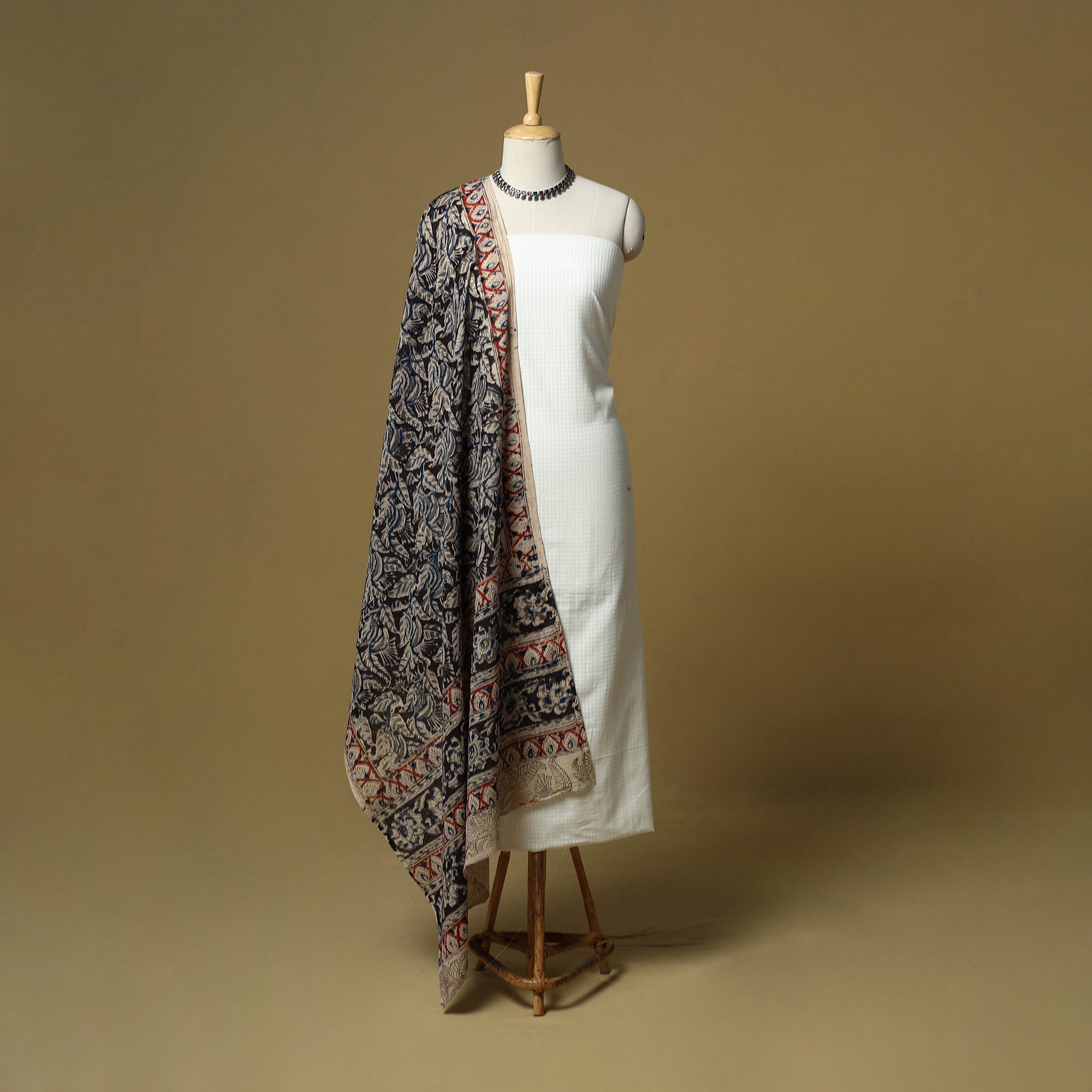 Pure cotton 3pc unstitched dress material set from Tamil Nadu features jacquard woven kurta fabric, where patterns are created directly during the weaving process. It is paired with kalamkari block printed bottom fabric and dupatta, made using hand carved wooden blocks. The combination of jacquard weaving and kalamkari printing brings together two textile techniques making this set unique. Easy to stitch and comfortable to wear, it works well for daily wear and casual outings.