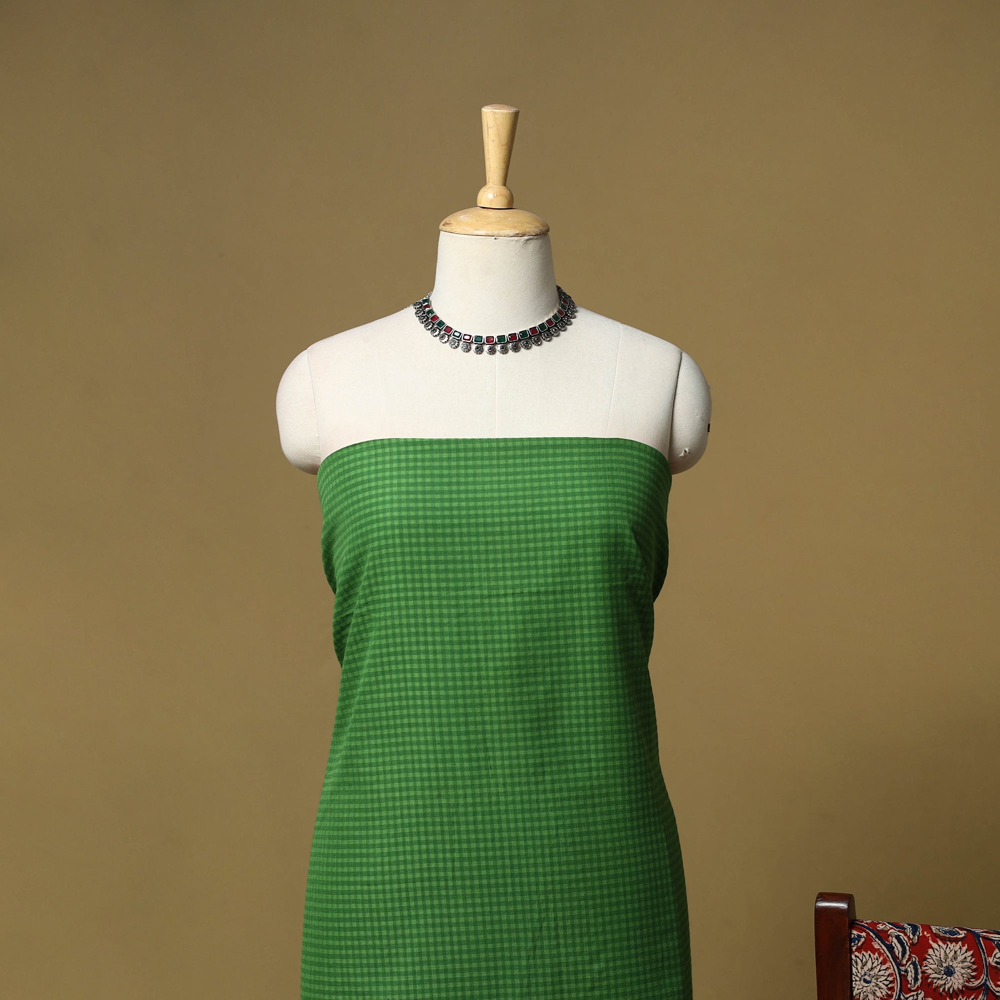 Pure cotton 3pc unstitched dress material set from Tamil Nadu features jacquard woven kurta fabric, where patterns are created directly during the weaving process. It is paired with kalamkari block printed bottom fabric and dupatta, made using hand carved wooden blocks. The combination of jacquard weaving and kalamkari printing brings together two textile techniques making this set unique. Easy to stitch and comfortable to wear, it works well for daily wear and casual outings.