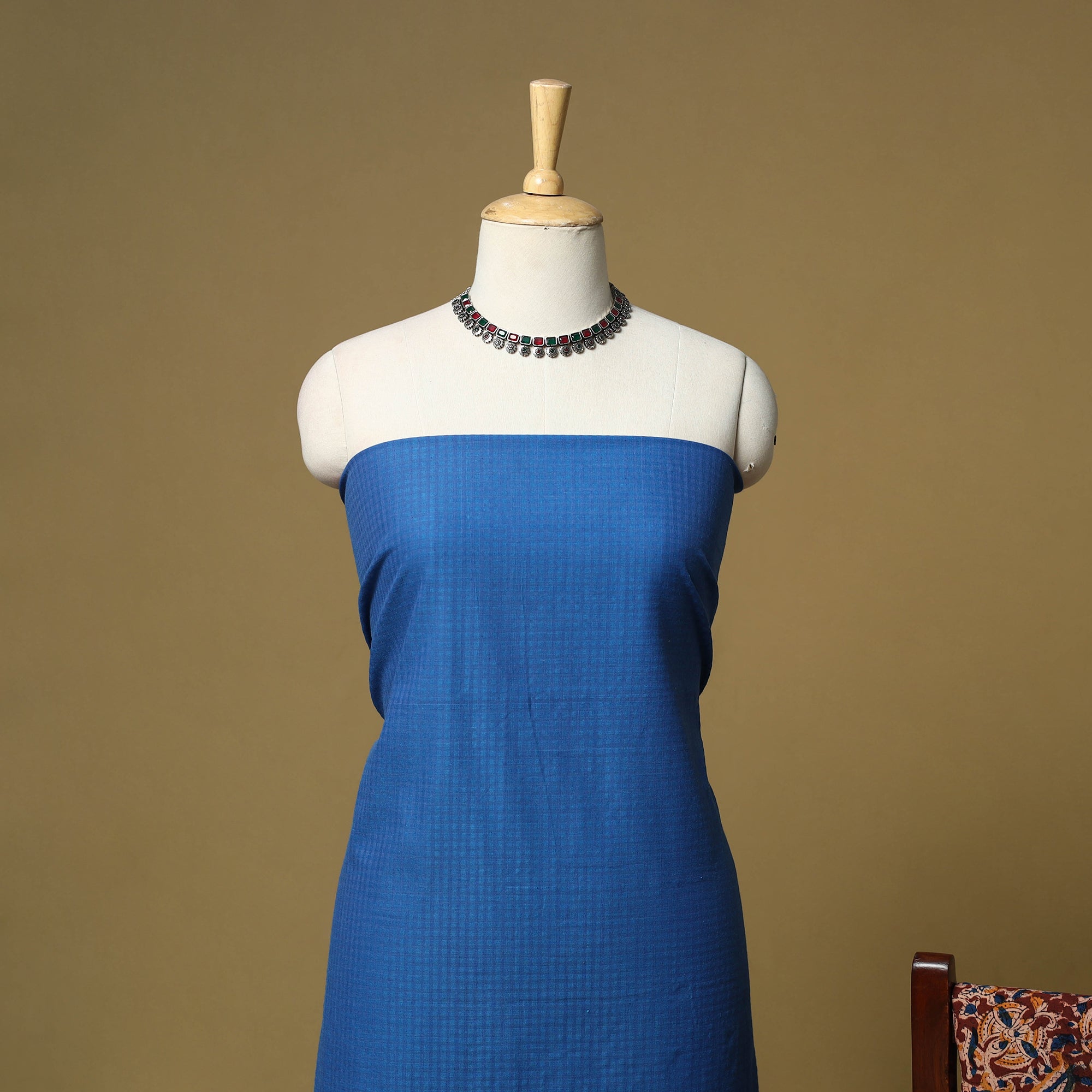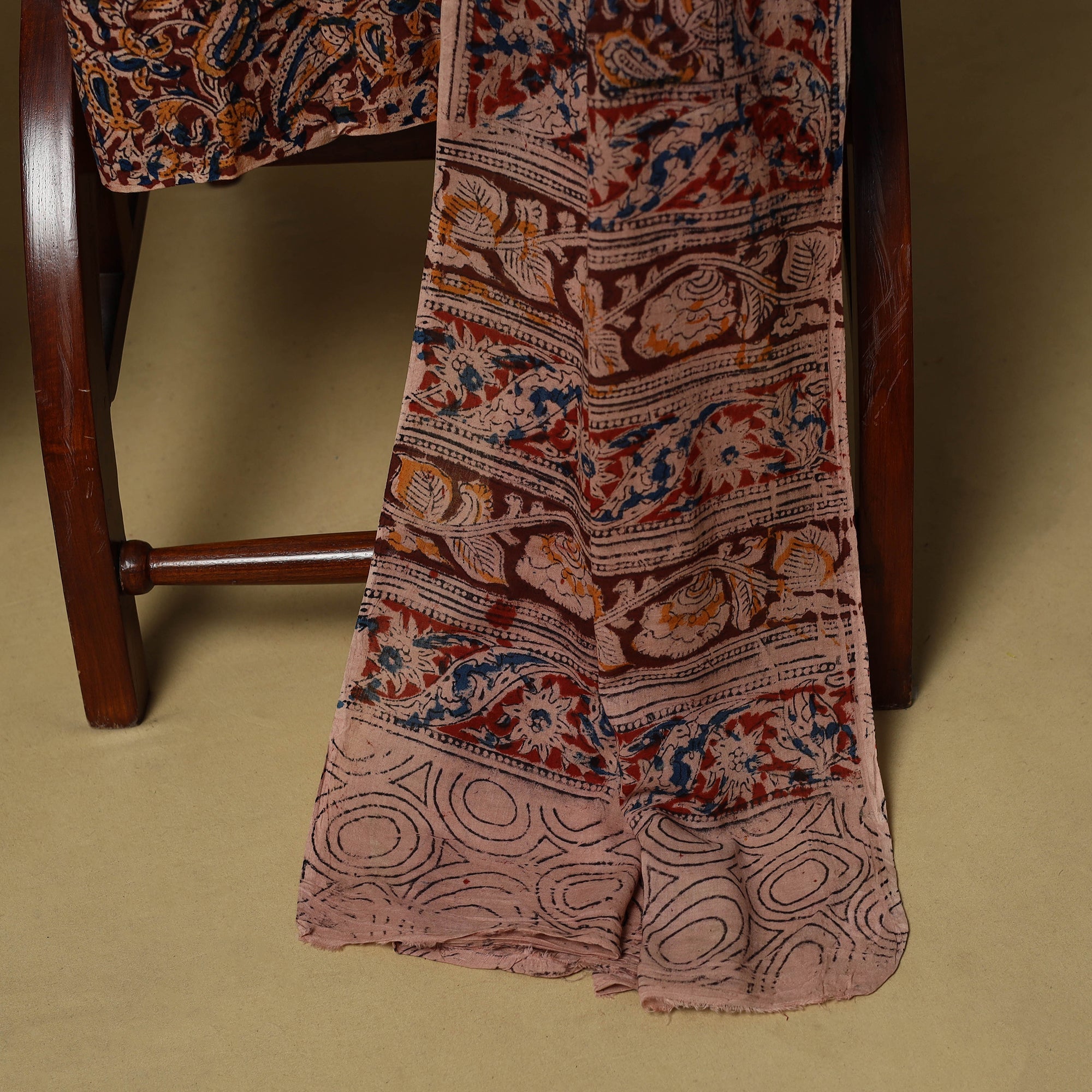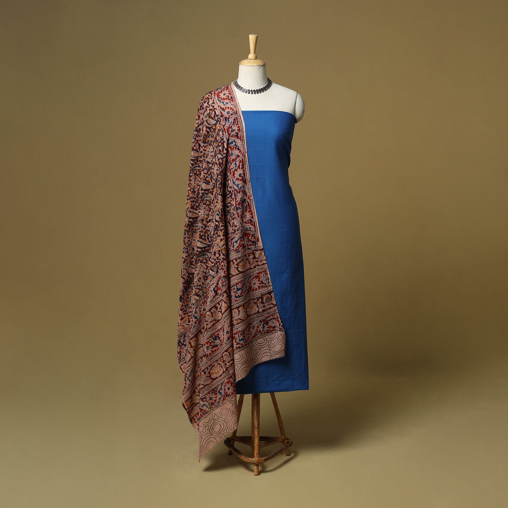 Pure cotton 3pc unstitched dress material set from Tamil Nadu features jacquard woven kurta fabric, where patterns are created directly during the weaving process. It is paired with kalamkari block printed bottom fabric and dupatta, made using hand carved wooden blocks. The combination of jacquard weaving and kalamkari printing brings together two textile techniques making this set unique. Easy to stitch and comfortable to wear, it works well for daily wear and casual outings.
