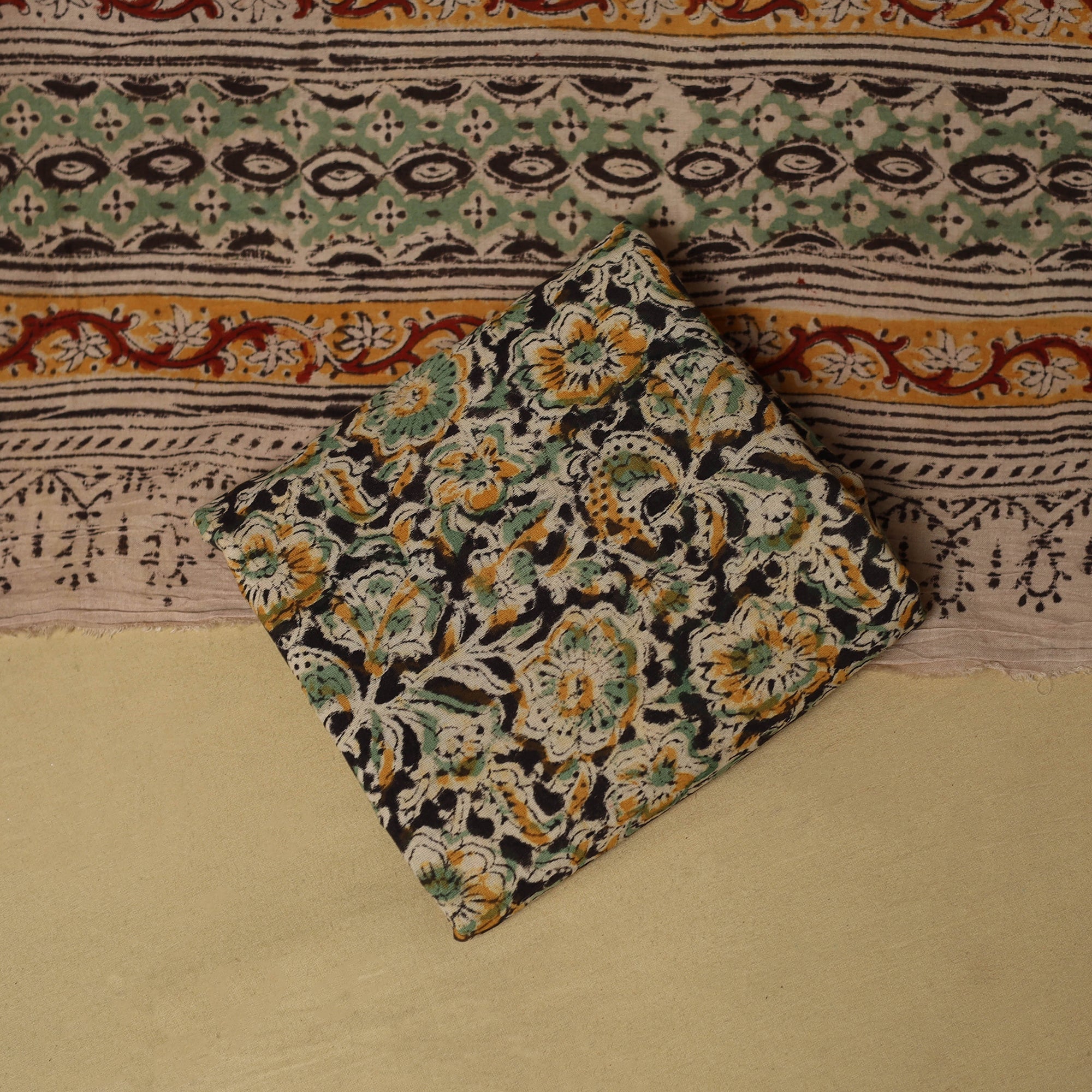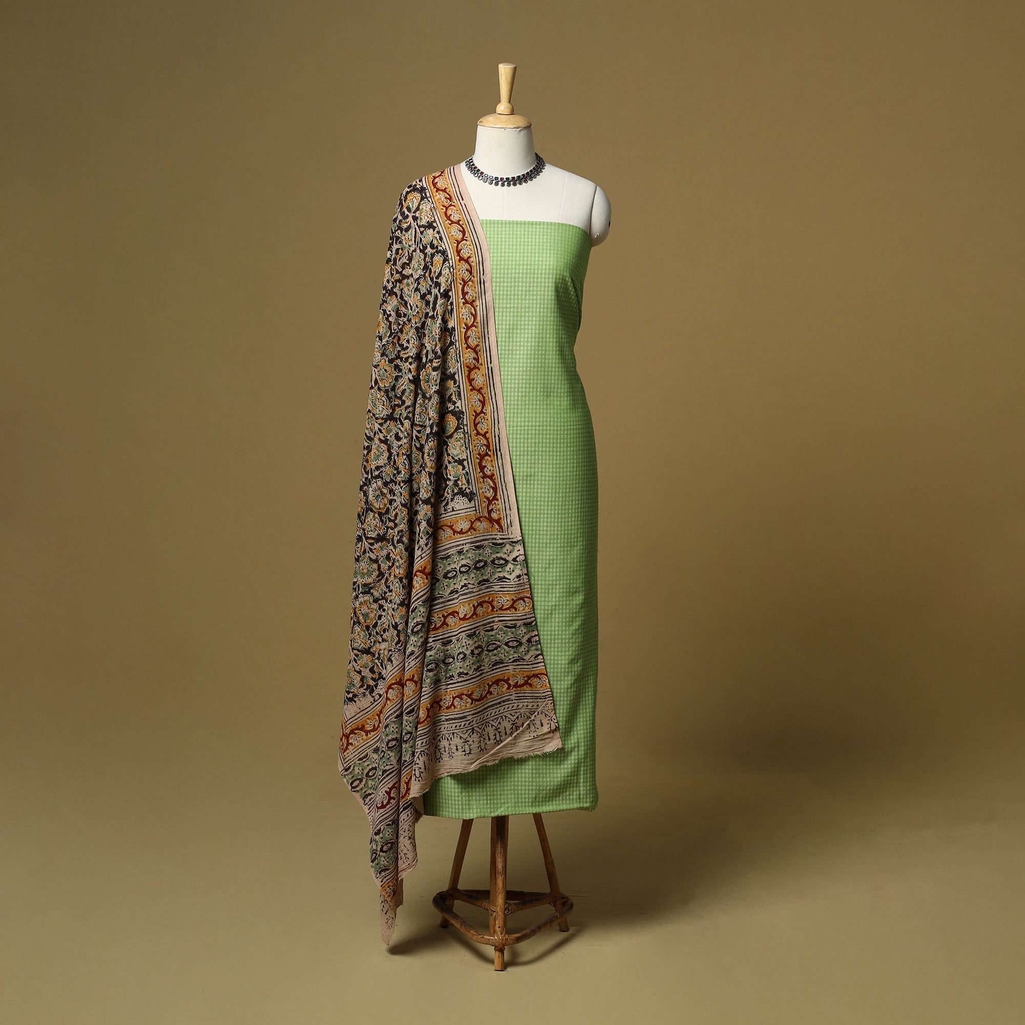 Pure cotton 3pc unstitched dress material set from Tamil Nadu features jacquard woven kurta fabric, where patterns are created directly during the weaving process. It is paired with kalamkari block printed bottom fabric and dupatta, made using hand carved wooden blocks. The combination of jacquard weaving and kalamkari printing brings together two textile techniques making this set unique. Easy to stitch and comfortable to wear, it works well for daily wear and casual outings.