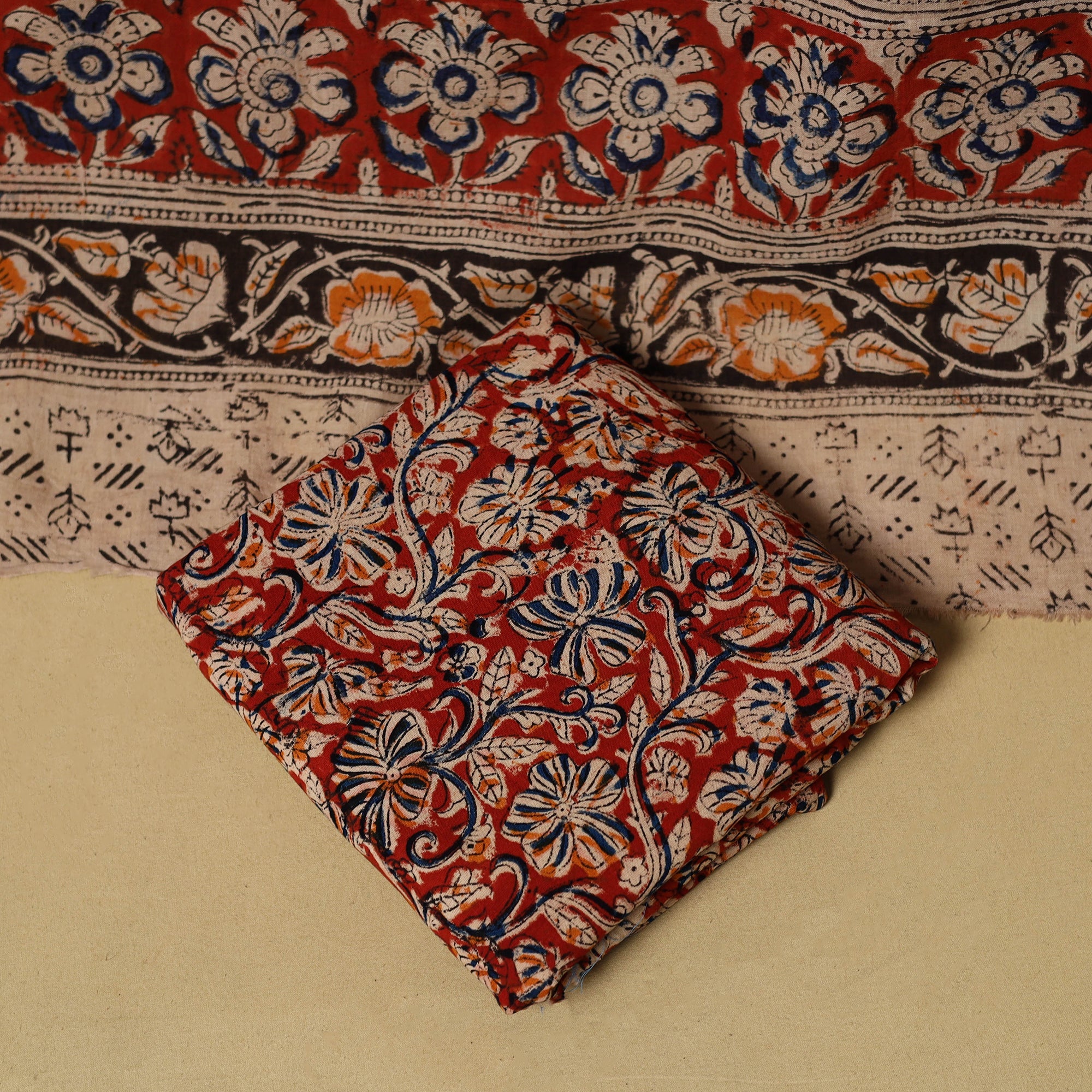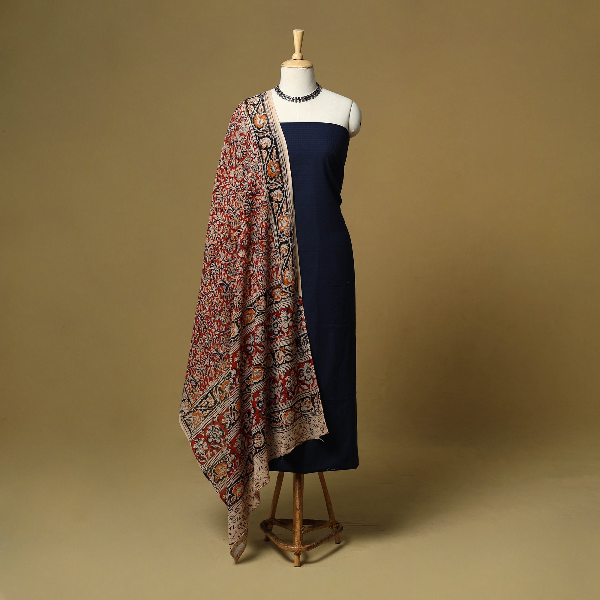 Pure cotton 3pc unstitched dress material set from Tamil Nadu features jacquard woven kurta fabric, where patterns are created directly during the weaving process. It is paired with kalamkari block printed bottom fabric and dupatta, made using hand carved wooden blocks. The combination of jacquard weaving and kalamkari printing brings together two textile techniques making this set unique. Easy to stitch and comfortable to wear, it works well for daily wear and casual outings.
