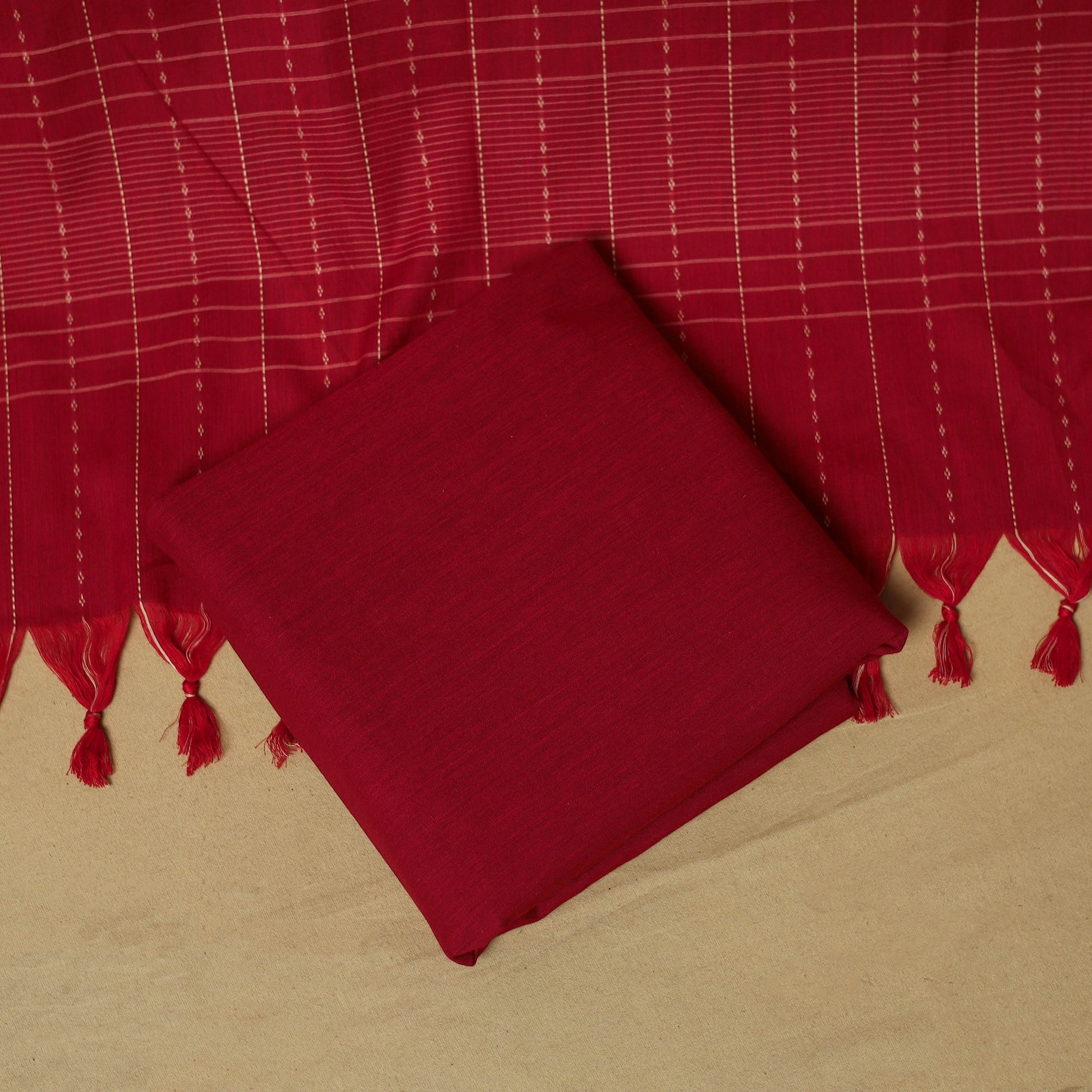 Pure cotton jacquard 3pc unstitched dress material set from Tamil Nadu, where patterns are created directly during the weaving process. This set includes a beautifully woven kurta fabric, bottom fabric, and a matching dupatta. Easy to stitch and comfortable to wear, this set works well for daily wear and casual outings.
