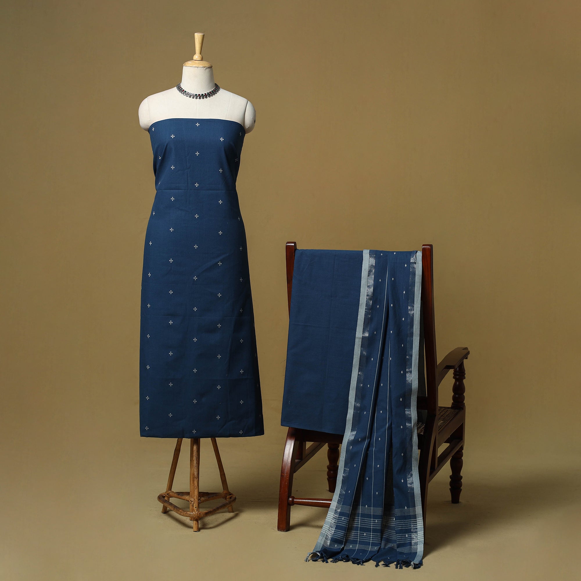 Pure cotton jacquard 3pc unstitched dress material set from Tamil Nadu, where patterns are created directly during the weaving process. This set includes a beautifully woven kurta fabric, bottom fabric, and a matching dupatta. Easy to stitch and comfortable to wear, this set works well for daily wear and casual outings.