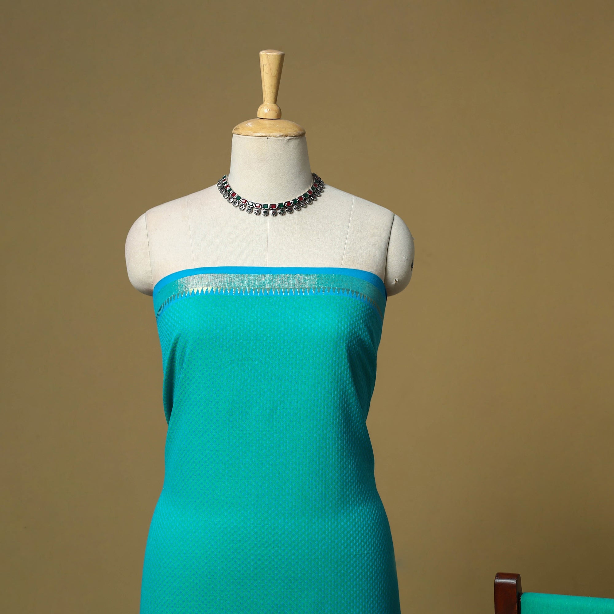 Pure cotton jacquard 3pc unstitched dress material set from Tamil Nadu, where patterns are created directly during the weaving process. This set includes a beautifully woven kurta fabric, bottom fabric, and a matching dupatta. Easy to stitch and comfortable to wear, this set works well for daily wear and casual outings.