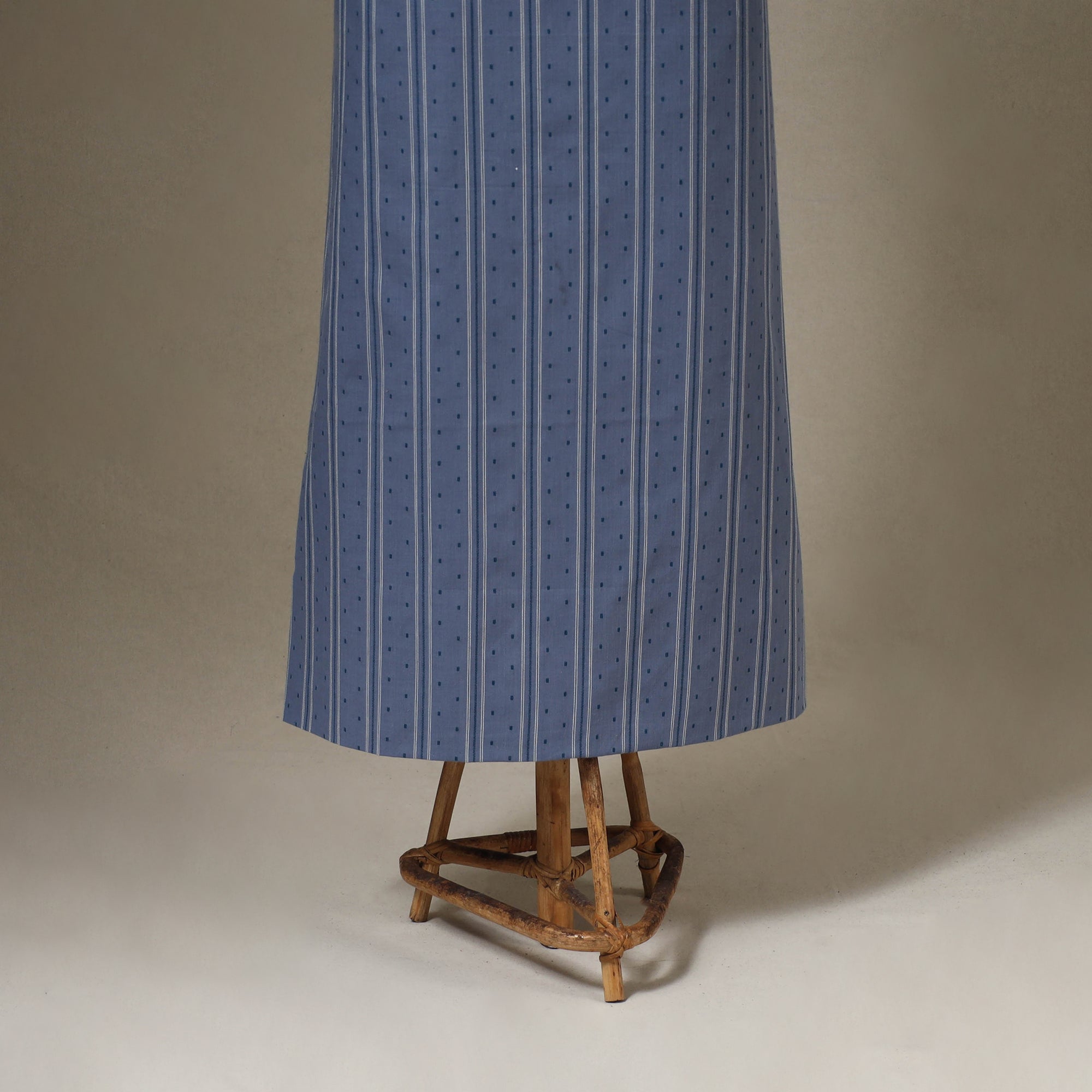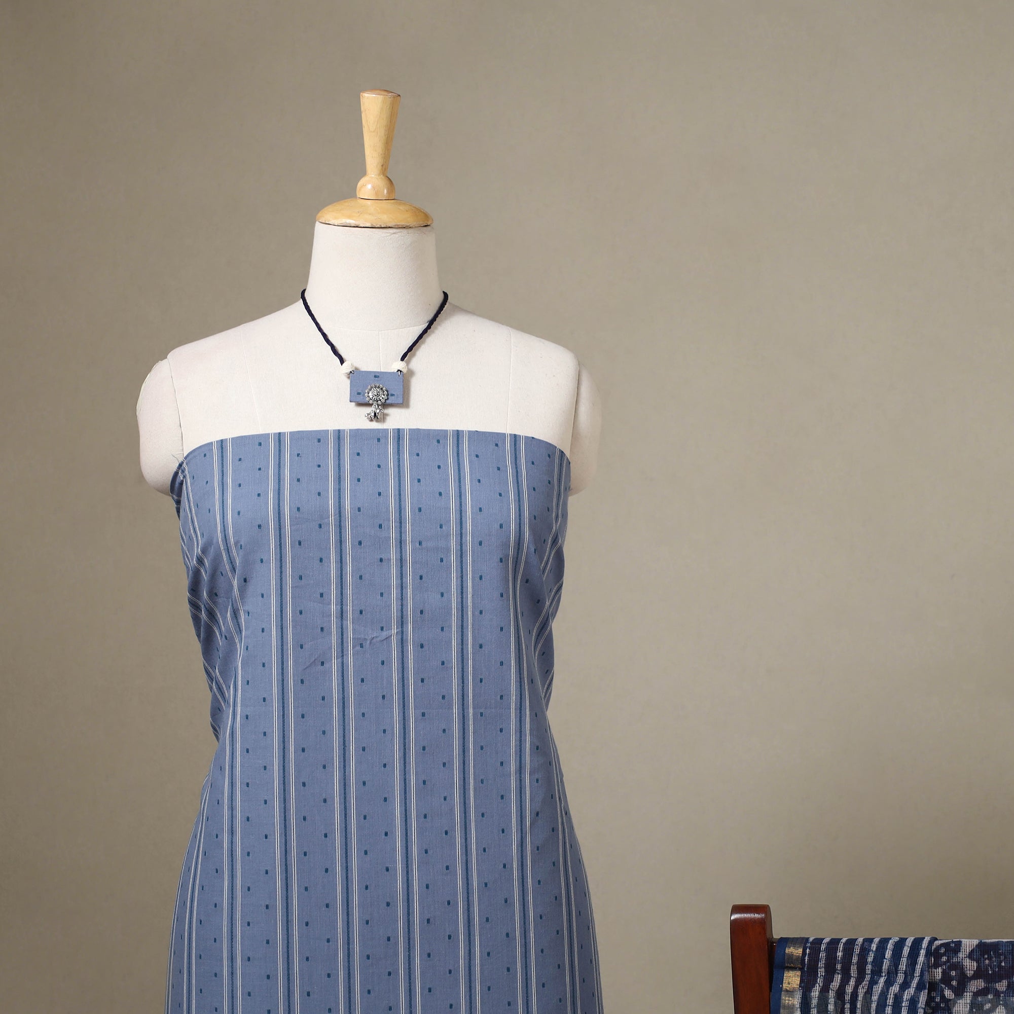 Elevate your ethnic wear collection with this elegant blue 2pc jacquard cotton dress material set. It includes a finely textured jacquard kurta fabric and a lightweight kota doria dupatta detailed with traditional bagru indigo prints. The set also comes with a handcrafted necklace and coordinating earrings are included, making it a complete pick for festive gatherings or cultural celebrations.